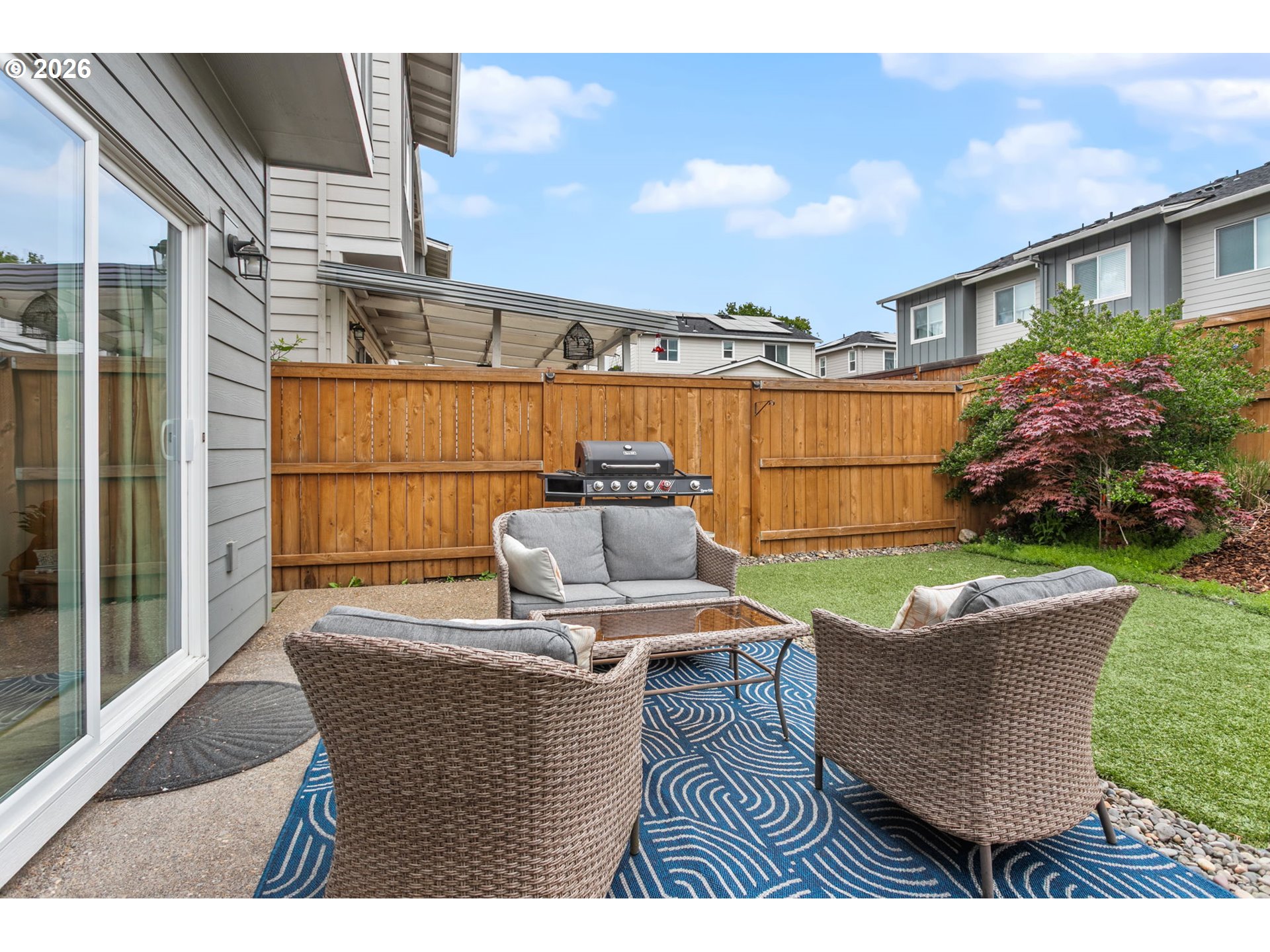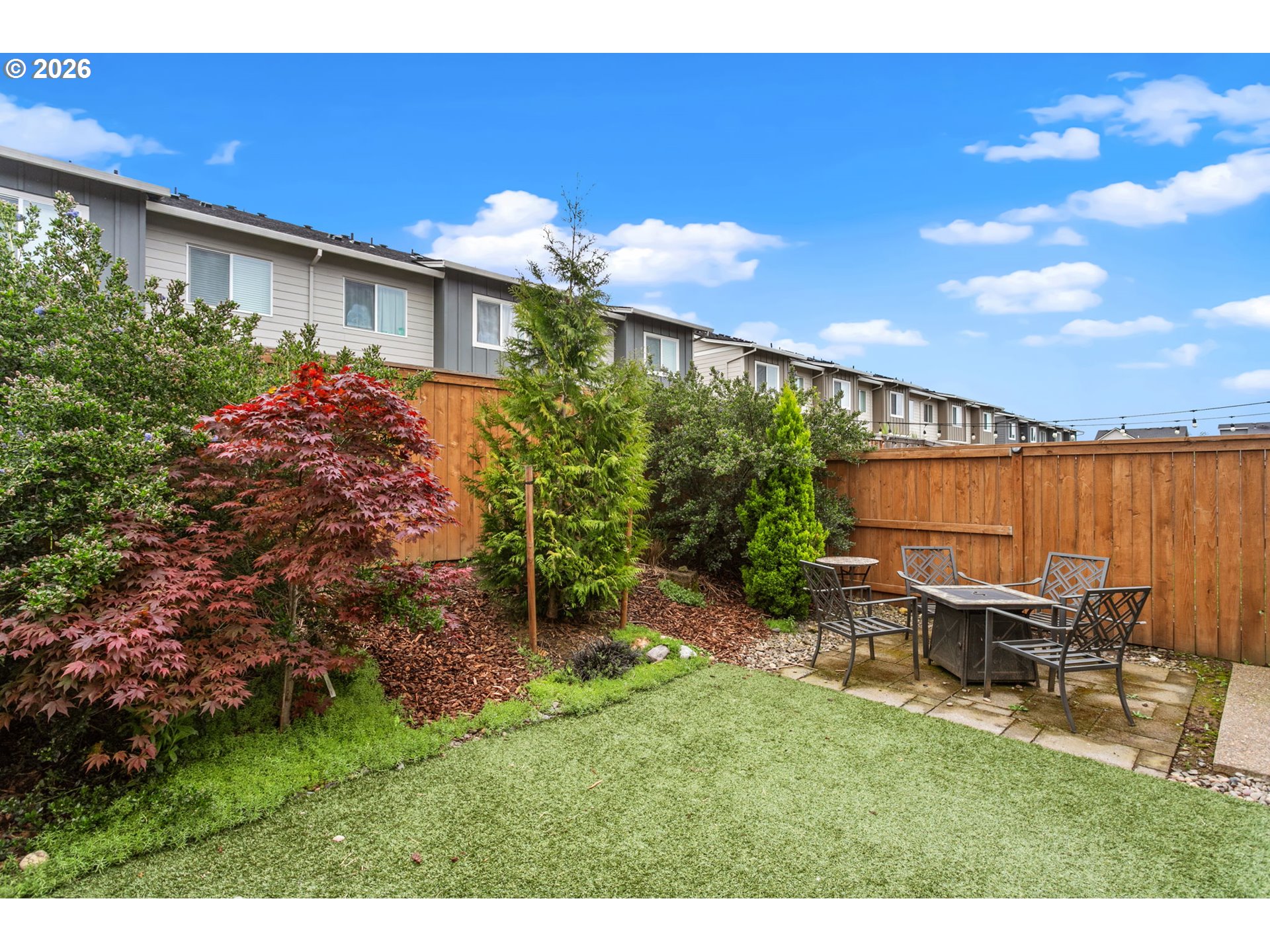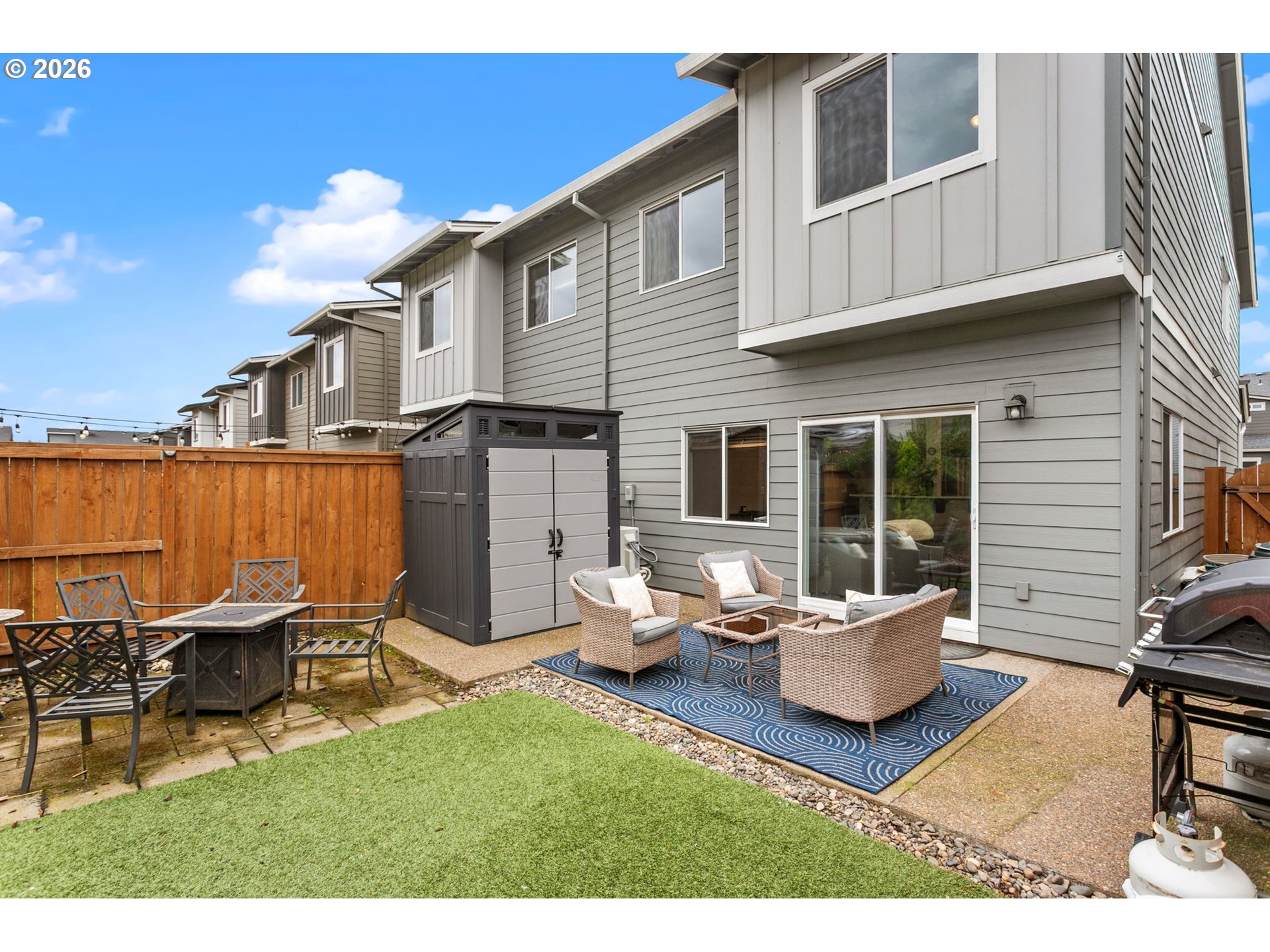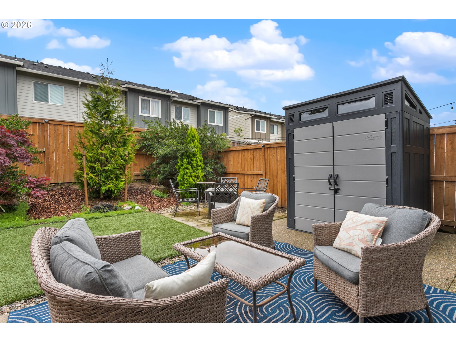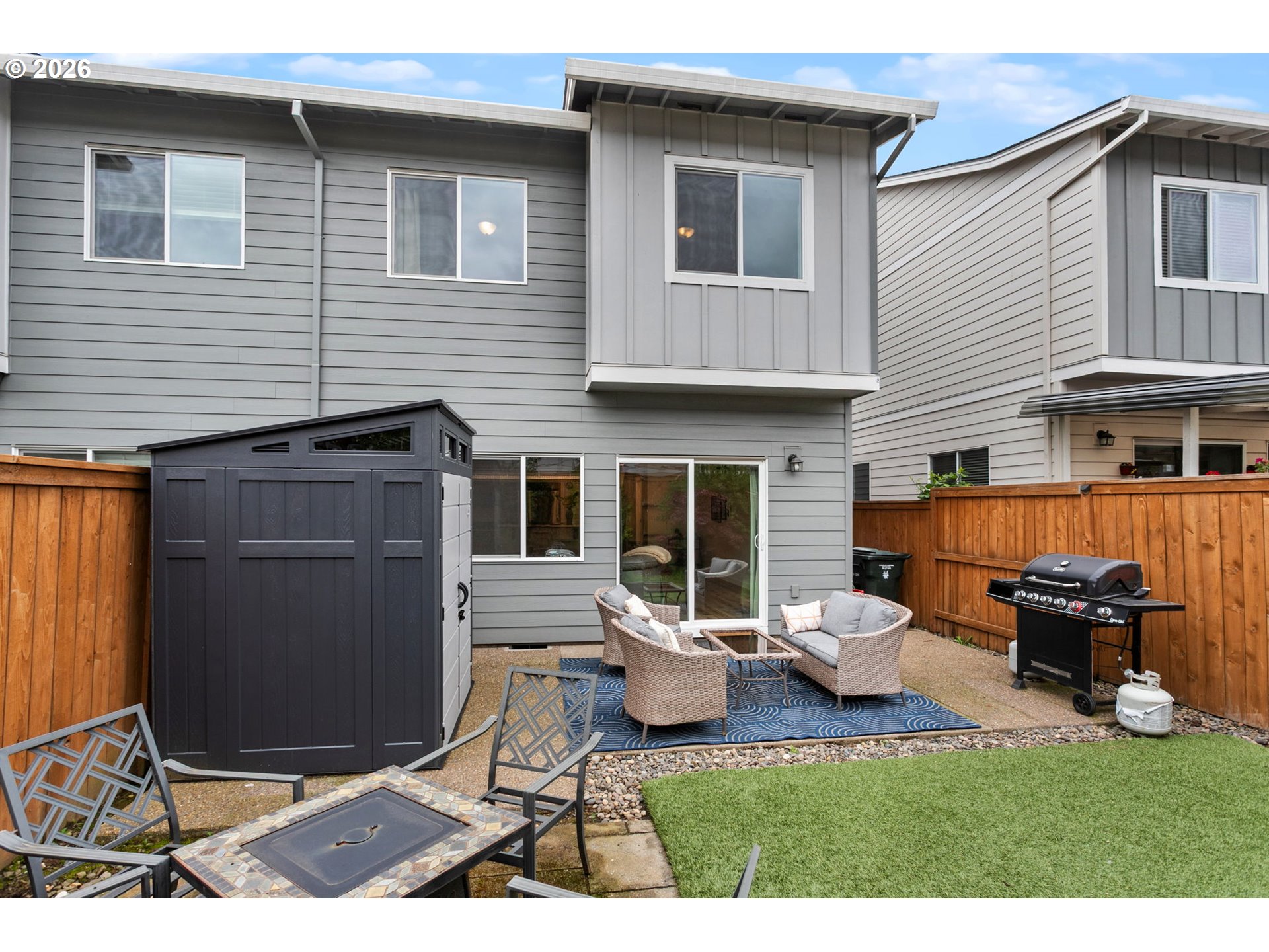 Welcome to this beautifully upgraded end-unit townhome offering comfort, style, and low-maintenance living in a peaceful setting near scenic Parks, shopping and walking trails. This 3-bedroom, 2.5-bath home features a thoughtfully designed layout with modern finishes throughout. The kitchen is equipped with sleek slab quartz countertops, stainless steel appliances, and both gas and electric stove options—perfect for any home chef. A full appliance package is included, with refrigerator, stove, washer, and dryer all staying. Enjoy upgraded luxury vinyl plank flooring, a tankless water heater, and a recently serviced mini-split system providing efficient heating and cooling year-round. Upstairs, the spacious primary suite impresses with vaulted ceilings, a custom walk-in closet by Portland Closet Company, and dual sinks. Additional highlights include a dedicated, updated laundry room and convenient attic storage. Step outside to a fully customized backyard designed for relaxation and ease, complete with turf, an integrated drainage system, landscaping, and a concrete patio—ideal for entertaining or unwinding with minimal upkeep. A storage shed is also included. This end unit townhome offers added privacy, complemented by a quiet neighboring setting. Located near beautiful Mariposa Park with large turf playground, soccer field and basketball court, this property combines natural surroundings with modern living.