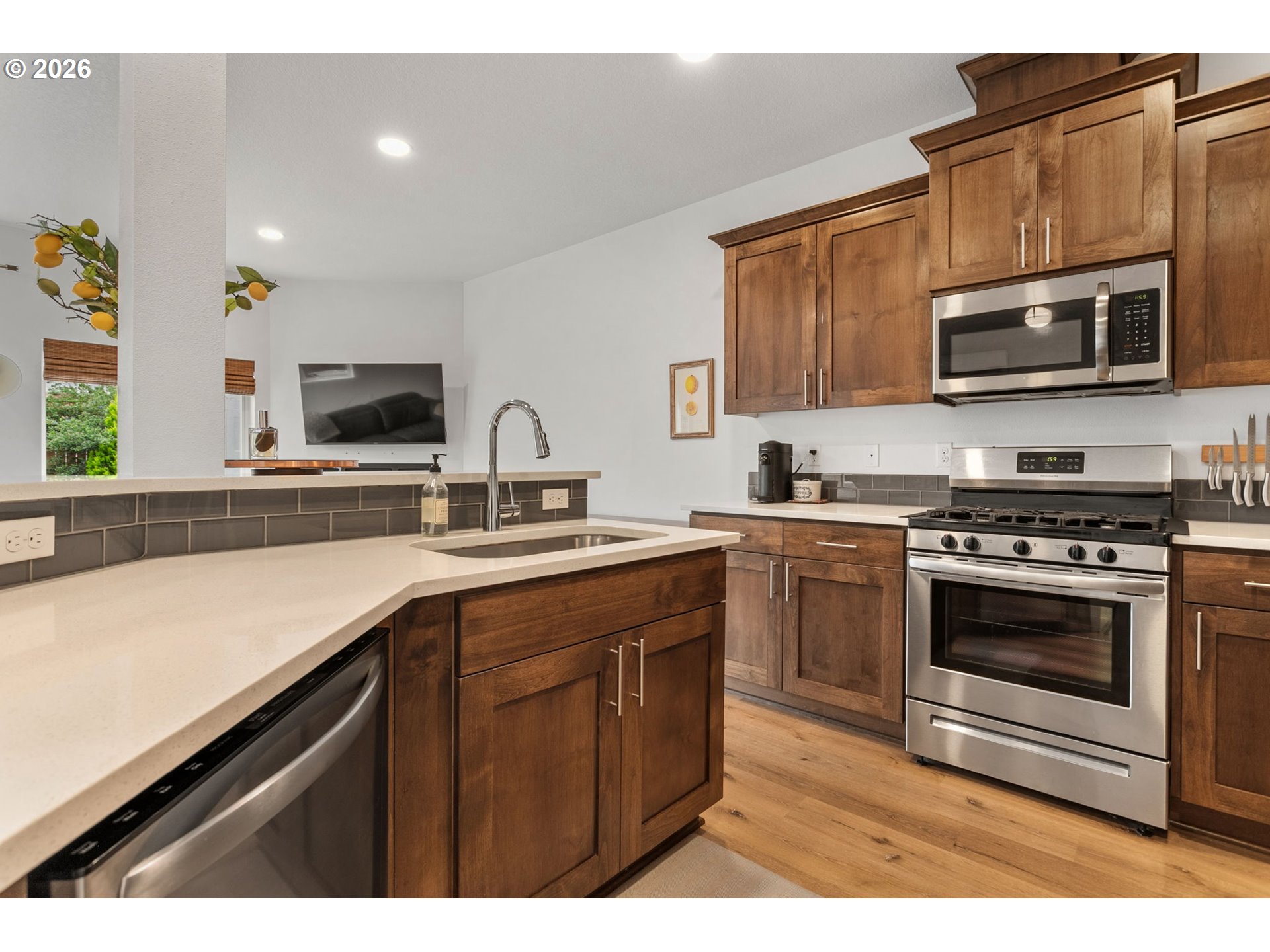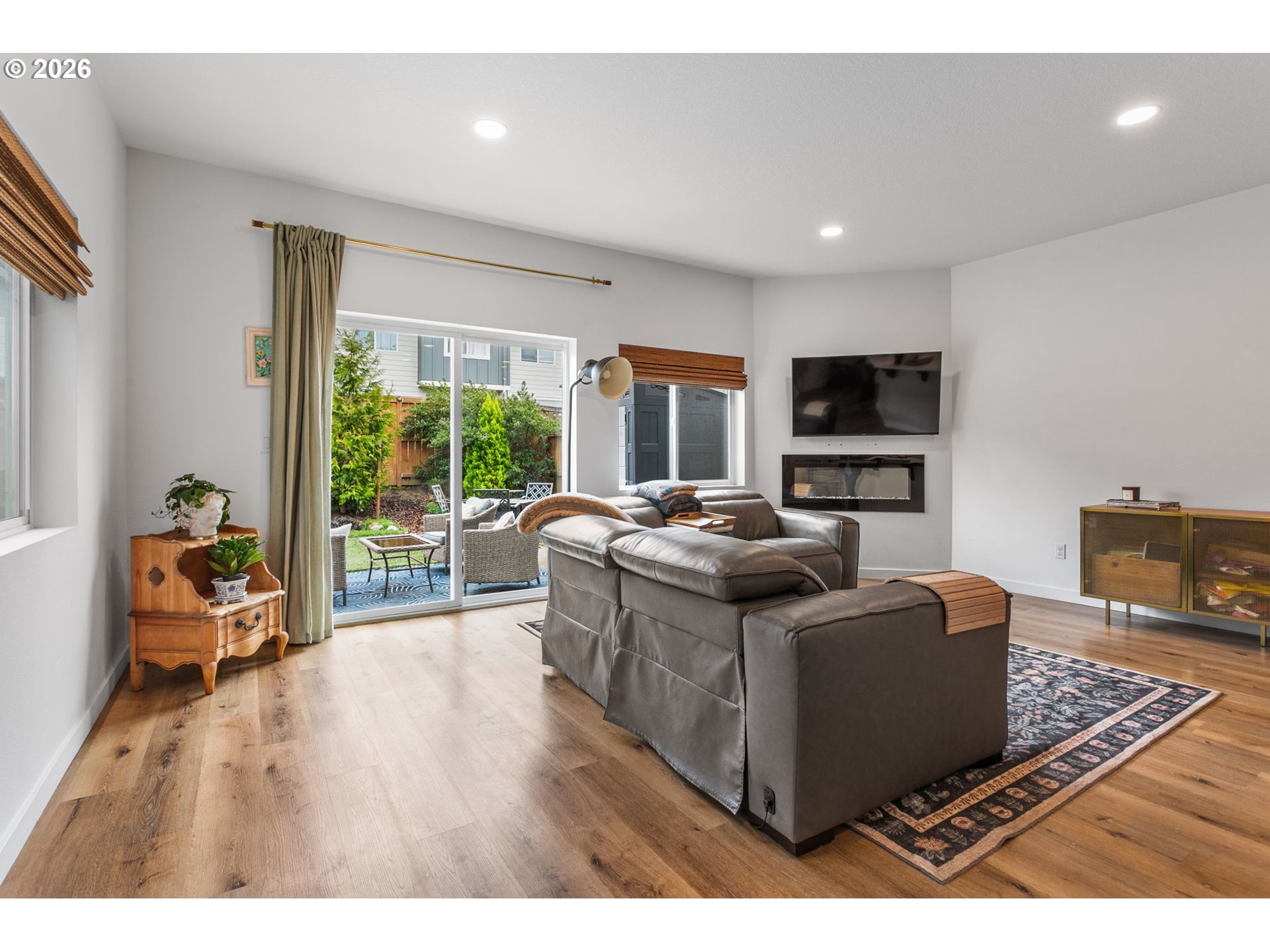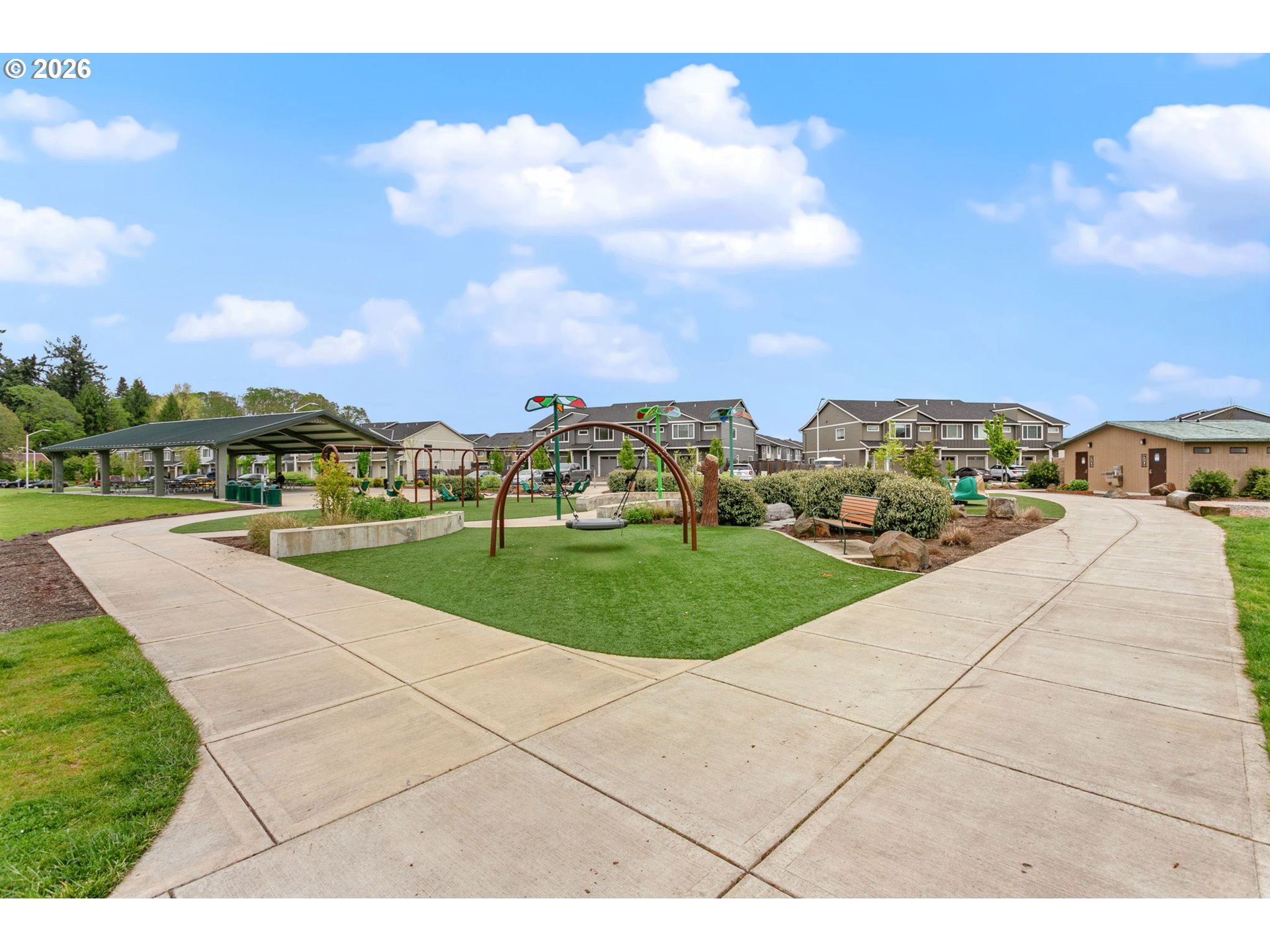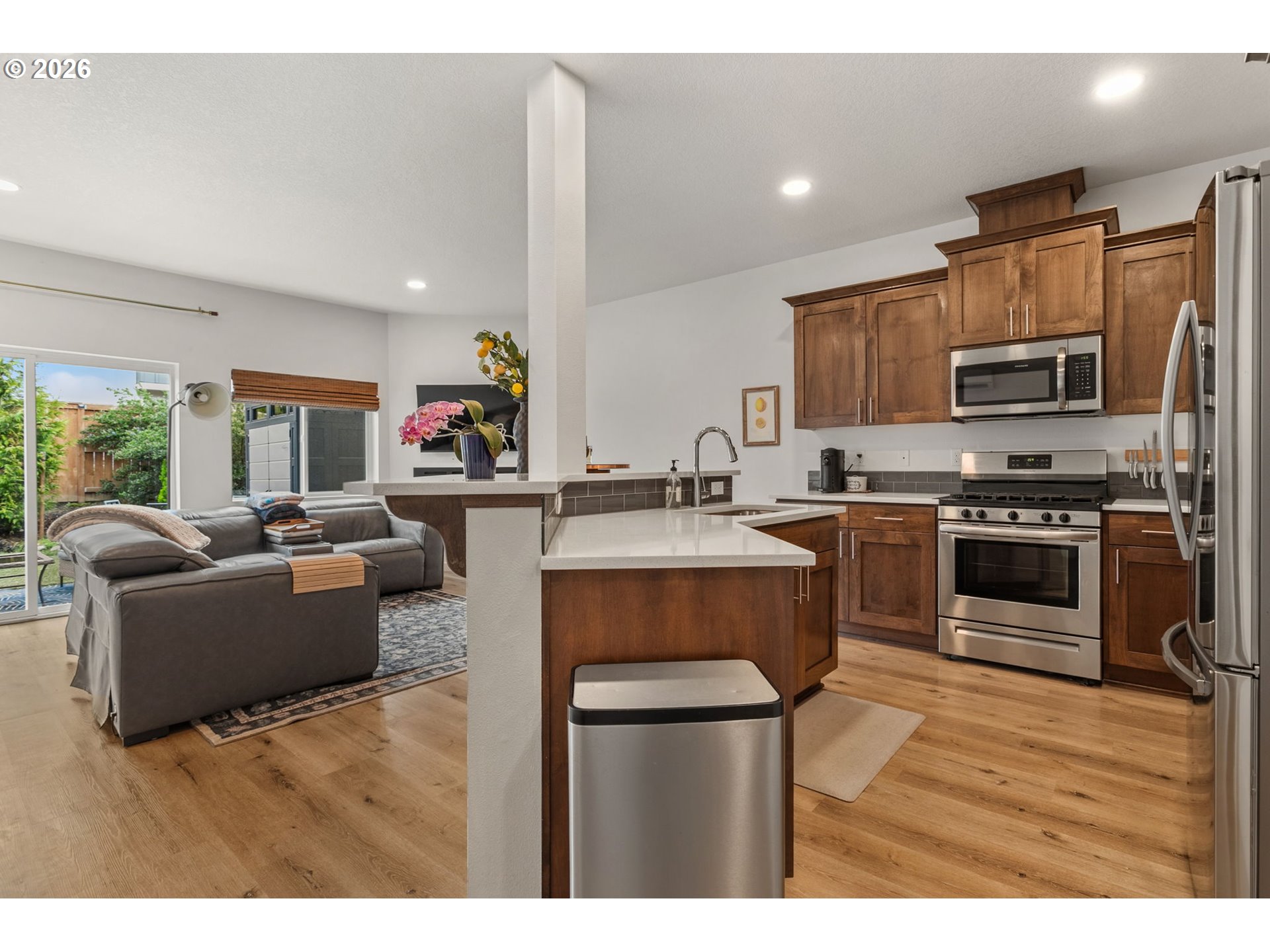 Welcome to this beautifully upgraded end-unit townhome offering comfort, style, and low-maintenance living in a peaceful setting near scenic Parks, shopping and walking trails. This 3-bedroom, 2.5-bath home features a thoughtfully designed layout with modern finishes throughout. The kitchen is equipped with sleek slab quartz countertops, stainless steel appliances, and both gas and electric stove options—perfect for any home chef. A full appliance package is included, with refrigerator, stove, washer, and dryer all staying. Enjoy upgraded luxury vinyl plank flooring, a tankless water heater, and a recently serviced mini-split system providing efficient heating and cooling year-round. Upstairs, the spacious primary suite impresses with vaulted ceilings, a custom walk-in closet by Portland Closet Company, and dual sinks. Additional highlights include a dedicated, updated laundry room and convenient attic storage. Step outside to a fully customized backyard designed for relaxation and ease, complete with turf, an integrated drainage system, landscaping, and a concrete patio—ideal for entertaining or unwinding with minimal upkeep. A storage shed is also included. This end unit townhome offers added privacy, complemented by a quiet neighboring setting. Located near beautiful Mariposa Park with large turf playground, soccer field and basketball court, this property combines natural surroundings with modern living.