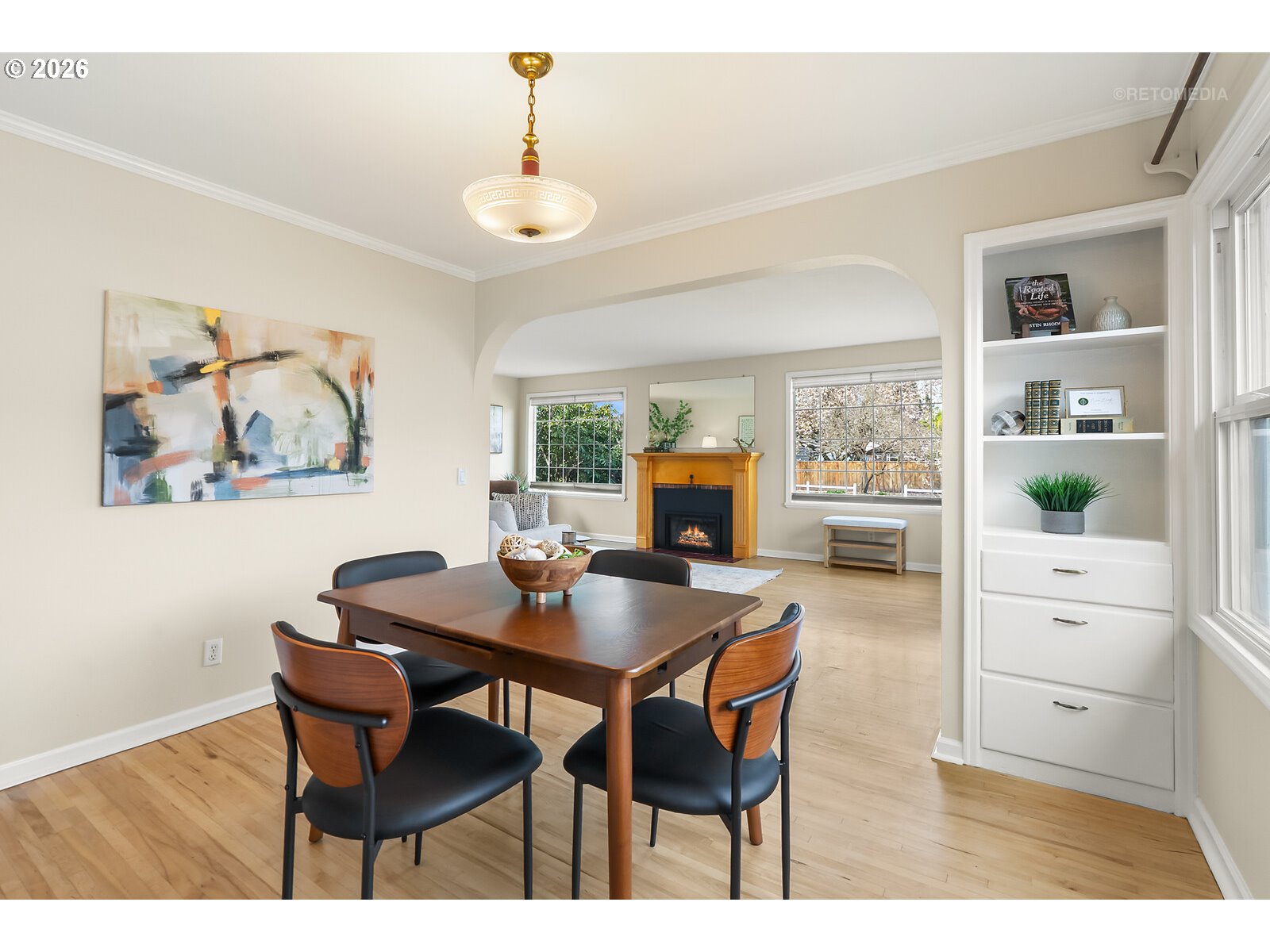 Welcome to this warm and inviting single-level home near downtown Hillsboro, offering 3 bedrooms, 2 bathrooms, and a beautiful blend of modern comfort and mid-century charm on a large, private lot.Inside, you’ll find stunning 1” maple hardwood floors and abundant natural light throughout. The cozy living room features a gas fireplace, while an elegant archway leads to the dining room with built-in shelving and continued hardwoods. The spacious kitchen offers generous counter space, ample cabinetry, a free-standing gas range, dishwasher, and stainless steel appliances.The primary bedroom is privately located on the opposite end of the home, complete with built-in shelving and wall-to-wall carpet. While not technically a suite, it has direct access to a full bathroom/utility room with tile flooring, a mud-set tile shower, and built-in cabinets. From here, step out to the covered patio for easy indoor-outdoor living.The backyard is truly special—large, fenced, and incredibly private with no visible neighboring homes. Enjoy a magical setting with two tool sheds, a smaller shed, chicken coop, raised garden beds, hot tub, and a cascading pond with goldfish and blooming lily pads. An irrigation well adds convenience.Energy efficiency shines with owned solar panels and double-pane vinyl windows. The oversized attached garage has been converted into a 34’ x 19’ climate-controlled studio with separate exterior access and durable flooring, easily convertible back if desired. A spacious driveway offers ample parking.Located close to shops, restaurants, coffee spots, bakeries, food carts, and local markets, this home is a peaceful retreat with everyday convenience—perfect for enjoying quiet mornings on the patio and cozy evenings at home. [Home Energy Score = 10. HES Report at https://rpt.greenbuildingregistry.com/hes/OR10246453]