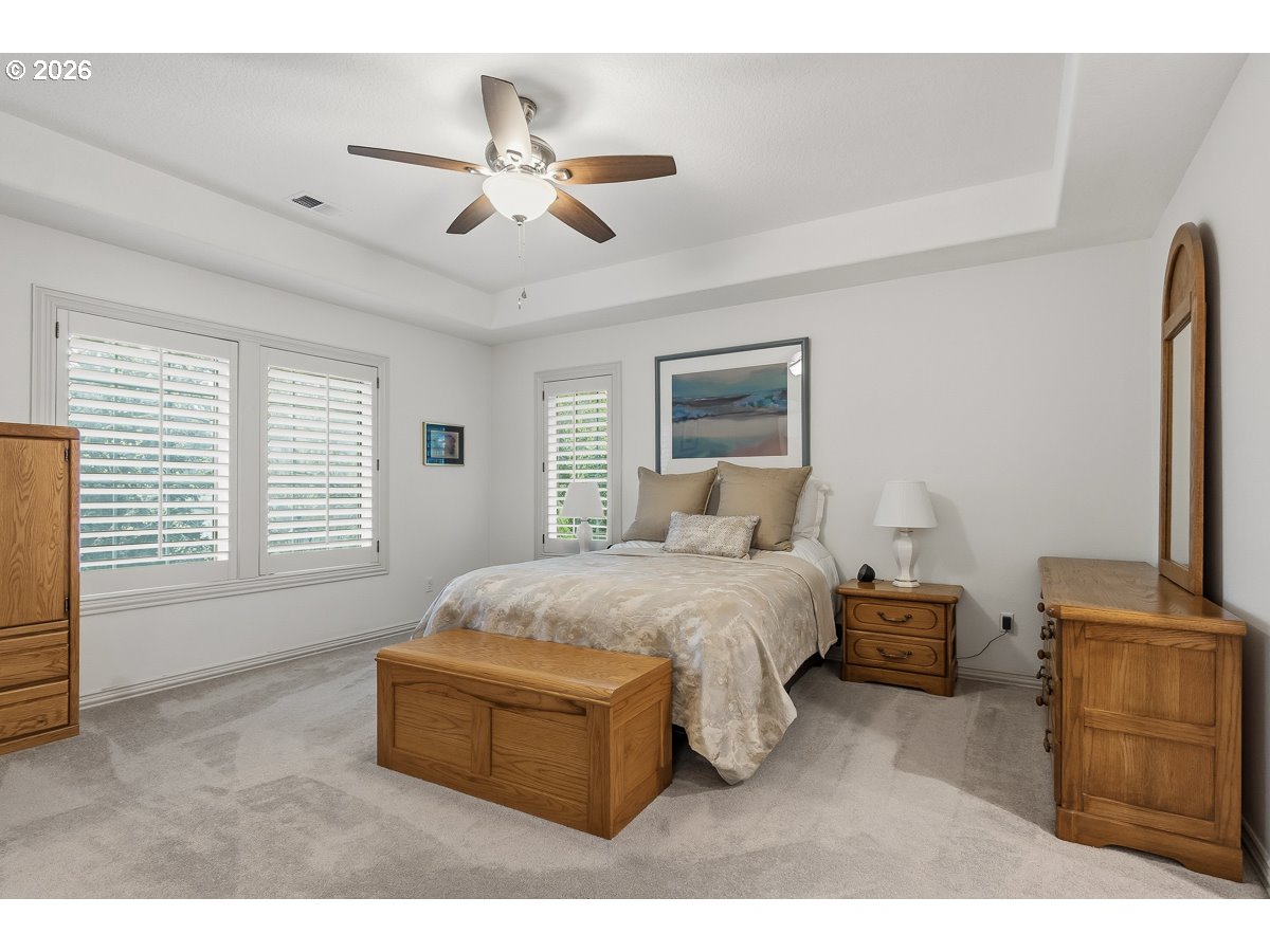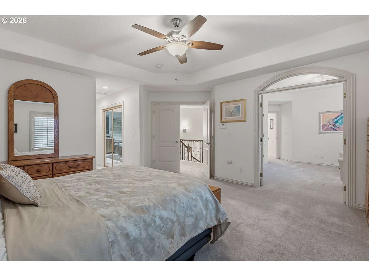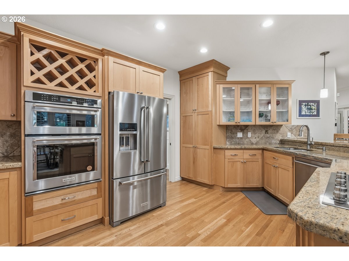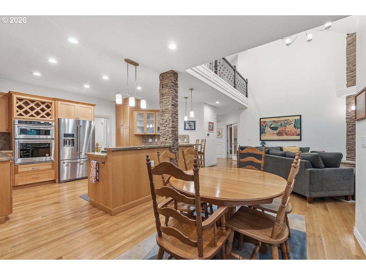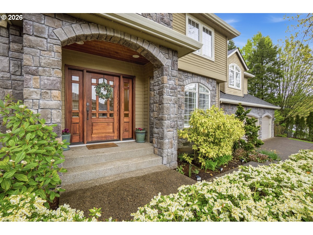 Nestled in the highly sought-after Madrona Heights neighborhood on Cooper Mountain, this exceptional residence offers a rare blend of luxury, comfort, and refined design on an expansive lot. Step inside to discover a stunning open-concept kitchen, thoughtfully appointed with granite slab countertops, a double oven (including a microwave/second oven combo), an eating bar, and a spacious dining area—perfect for both everyday living and elegant entertaining. The adjoining family room impresses with nearly 20-foot soaring ceilings, a striking stone-surround gas fireplace, and solar tube skylights that bathe the space in natural light. The primary suite provides a private retreat, complete with a walk-in shower, jetted soaking tub, and dual closets. Extensive hardwood flooring spans the main level, enhancing the home’s warmth and sophistication. One of the standout features is the beautifully designed office/den, featuring custom built-ins and a private exterior entrance—ideal for working from home or meeting clients in style. Outdoors, enjoy a serene and thoughtfully landscaped backyard with multiple covered patios, tranquil walking paths, and a flowing waterfall feature that creates a peaceful ambiance year-round. Recent Updates & Improvements: Roof and skylights replaced (2025) Waterfall pump replaced (2025) Garage security entry door installed (2025) Laundry countertops and sink installed (2025) Tesla charger installed (2022) Solar tube skylights added in family room (2021) Water heater replaced (2021) Hot water recirculating pump replaced (2021) Refrigerator replaced (2021) Downstairs bath vanity installed (2021) Gas fireplace insert installed (2021) Oven, stove, and dishwasher replaced (2019)Washer and dryer replaced (2019) Full interior paint (2019)This is a rare opportunity to own a meticulously maintained and thoughtfully upgraded home in one of the area's most desirable locations.