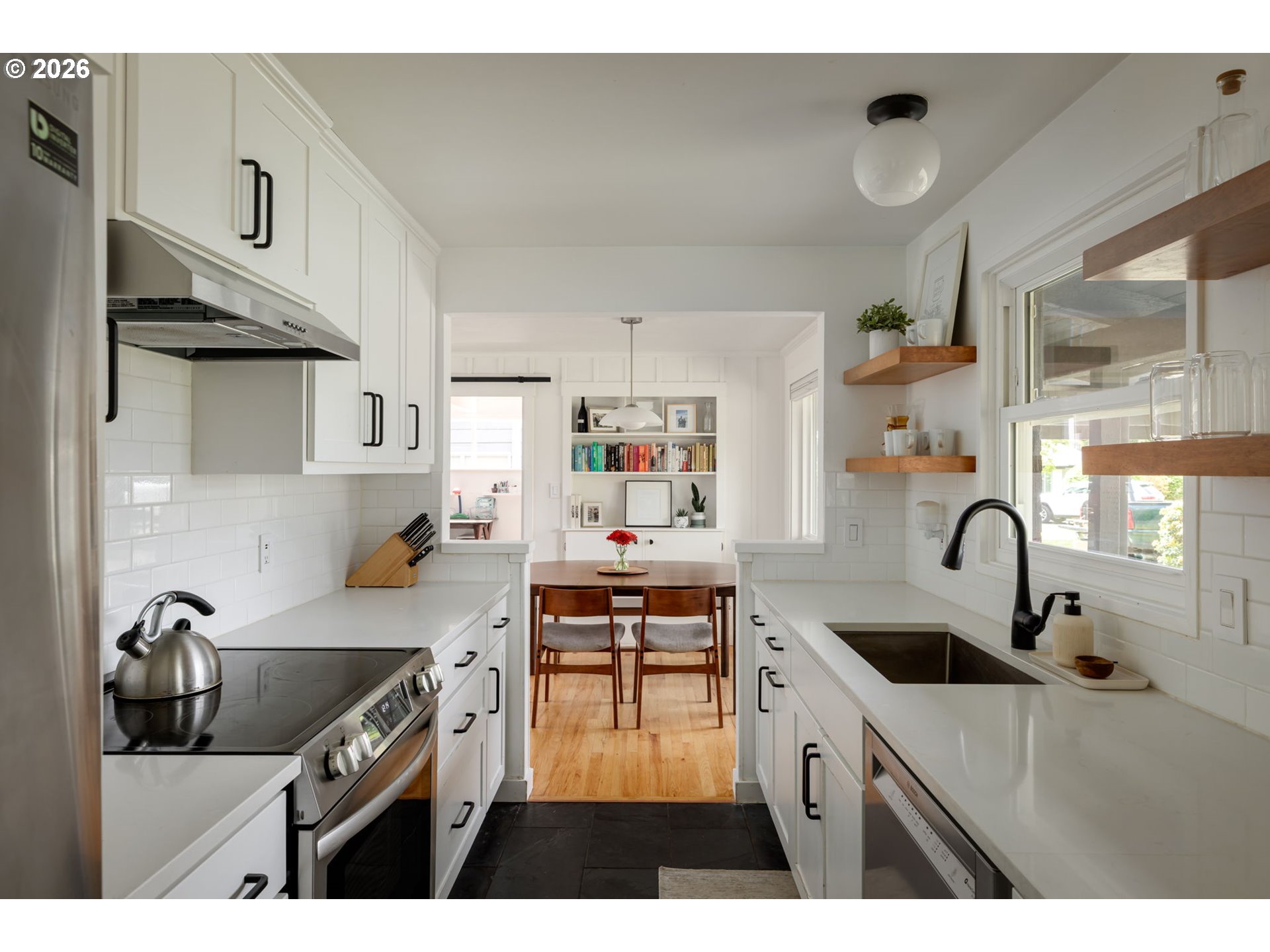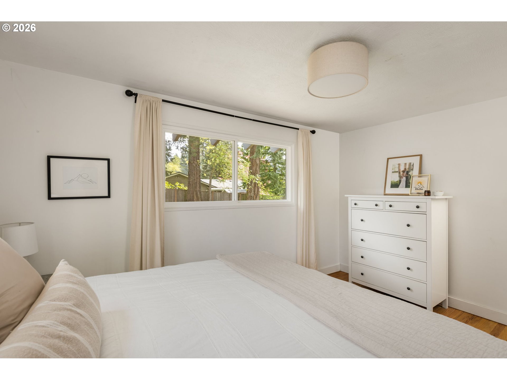 Reimagined mid-century gem on a quiet cul-de-sac in the heart of West Slope. This single-level home blends original character with thoughtful updates to provide modern convenience. Step in from the covered front porch where white oak hardwood floors, stylized fixtures, and abundant light root the home in timeless appeal. The extensively remodeled kitchen honors clean MCM lines with quartz countertops, new appliances, beautiful tile, and floating wood shelves. The generous living room showcases a statement brick fireplace and floor-to-ceiling windows that invite the outdoors in. A dedicated dining space with built-in storage is the perfect place to gather for meals. This optimal floor plan features a rare bonus family room and a full second bathroom plus laundry center with a new stacking washer and dryer. Three bedrooms and an updated bathroom anchor the north end of the home together.Outside, experience a backyard designed for use with room to run, play and garden. No detail was spared in recent updates, including a newer furnace and A/C, an updated electrical panel, water heater, new windows and patio door, and updated lighting throughout. Ideally located in Washington County with easy access to downtown, Nike, and just a short walk to Ridgewood Elementary School and Ridgewood View Park.