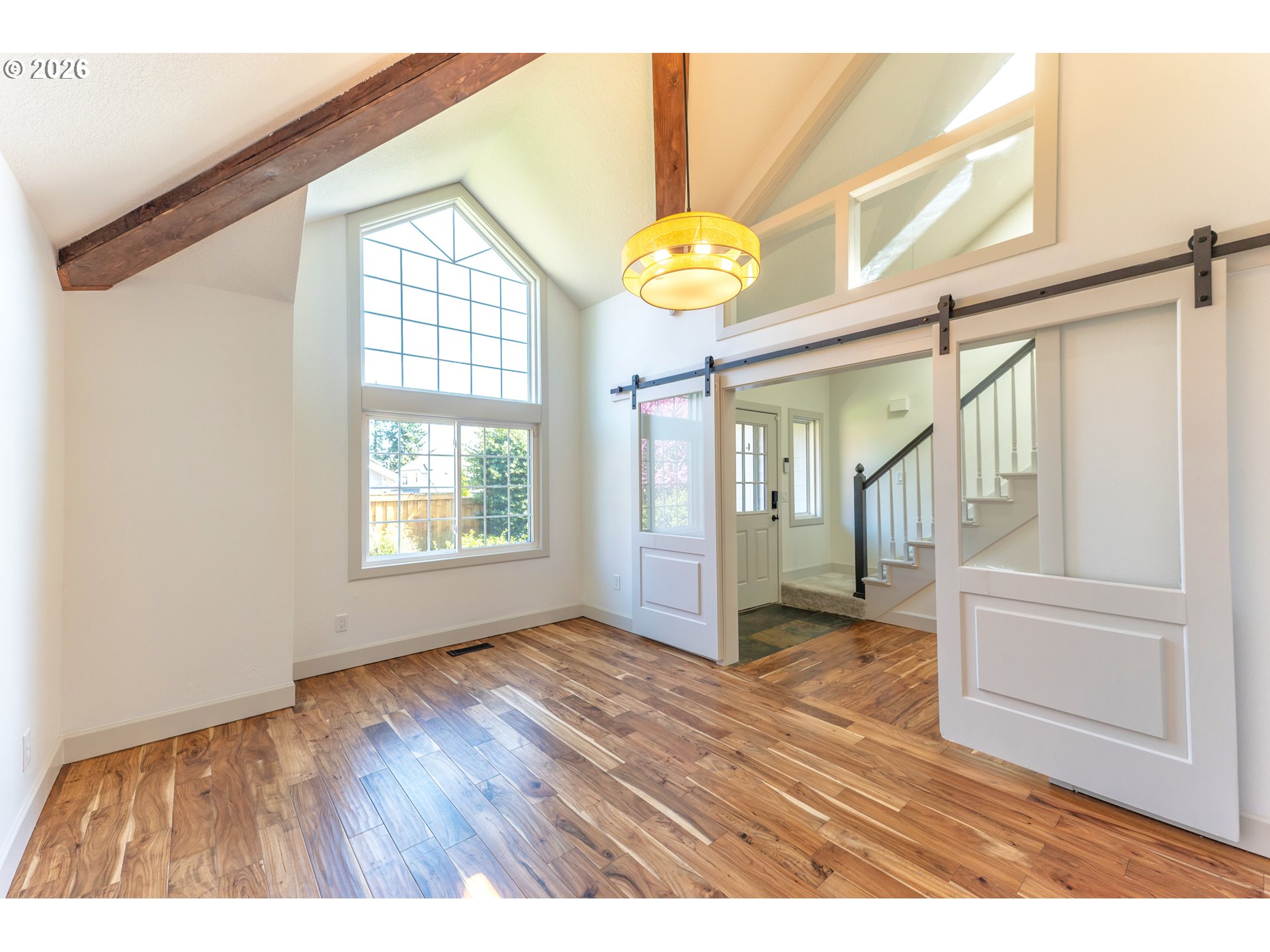 Welcome home to this beautiful Tigard gem in a fantastic location. Set on a corner lot along a semi-private street, this 4-bedroom, 3 full bathroom home offers 2,148 sq ft of comfortable, light-filled living with a flowing and flexible floor plan. The entry features a spacious & tall ceiling with a custom coat rack for backpacks & coats & pet leashes. The main level featuring engineered hardwood floors, a spacious Great Room with gas fireplace, built-ins and door to deck and the beautiful backyard. What a stunning & bright vaulted flex room with tall windows, barn doors, and wood beam accents—perfect for a home office, den, dining room or playroom.The updated gourmet kitchen shines with quartz counters, stainless steel appliances, hood vent, big farm sink, custom craftsman eating bar, pantry & tile floors. Upstairs are four bedrooms, including a welcoming primary suite with high ceilings & W-I closet and a beautifully updated vaulted bath w/skylight. The hall bath is newly renovated featuring a skylight. New carpet throughout upper floor. Another great feature is the large flexible bonus room off the garage which could be a great extra guest space as there is a full bathroom on the main floor! A new 95% hi-efficiency furnace and A/C keep things comfortable year-round. Step outside and enjoy the fun, resort-style backyard with a partially covered 400 SF deck, gazebo with hot tub, gas firepit hookup, tall garden beds, palm trees, artificial turf, and stone pathways—ideal for entertaining or unwinding, and two spacious tool sheds. A truly oversized 1-car garage offers great storage. The driveway is extra long offering lots of parking space! LeafGuard gutters and extra attic insulation add peace of mind. Just minutes to Summerfield Golf Course, Cook Family Park, Trader Joe’s, Bridgeport Village, parks, and miles of trails—this is a home that truly invites you to relax and enjoy a great lifestyle inside and out!