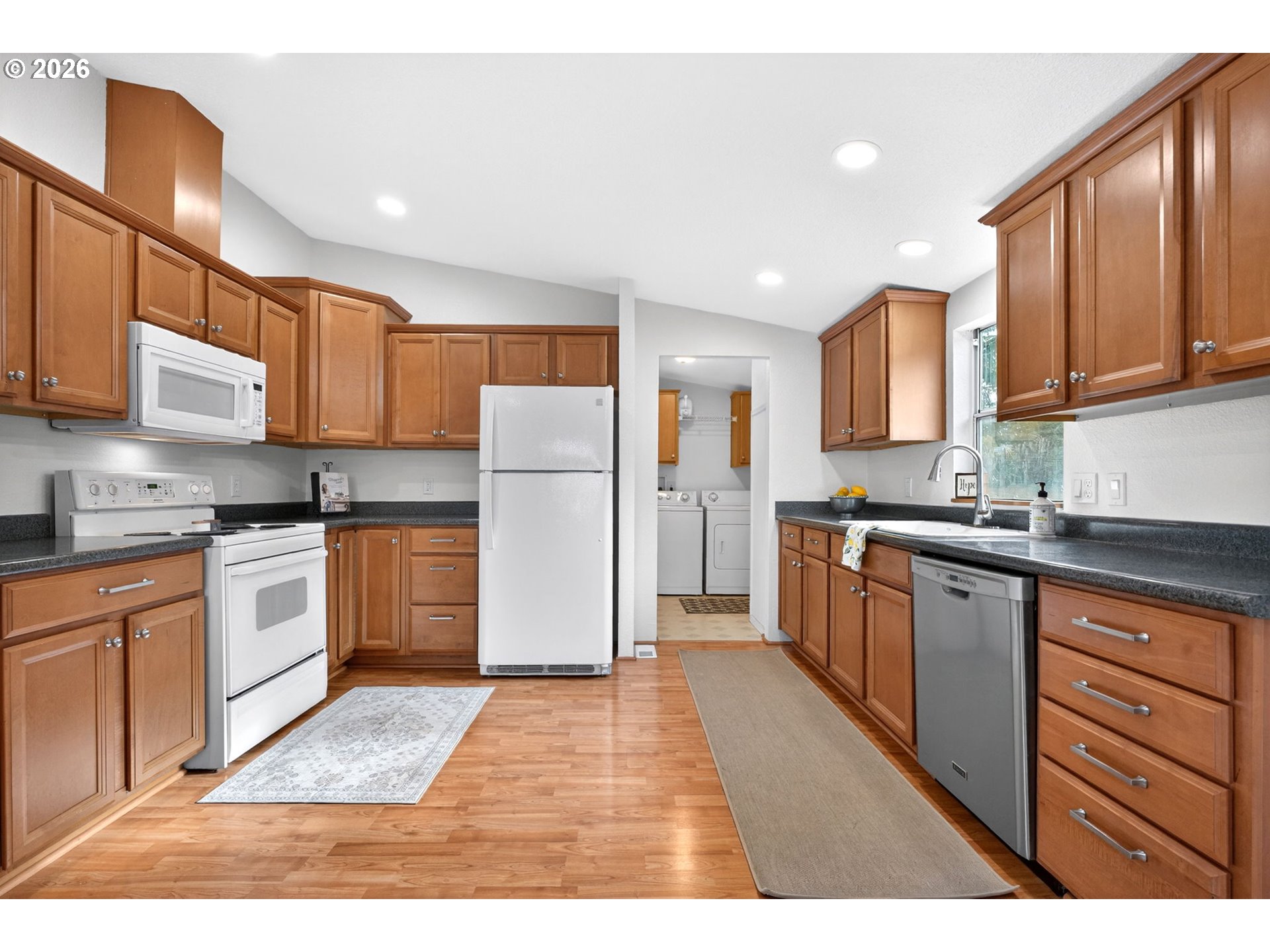 Meticulously Maintained with Beautiful Updates; Laminate Flooring; Vaulted Ceilings; Featuring 3 Bedrooms and 2 Full Baths; Large Kitchen with a Free Standing Fridge, Custom Built-Ins and Plenty of Storage; Laundry Room with Washer & Dryer; Primary Bedroom with Private, Updated Bathroom and Slider to the Backyard; Detached 2 + Car Oversized (24X36) Garage Could Also Double as a Shop with A/C & Heat, Separate Electrical Panel with 240 Power; New Roof; New Interior and Exterior Paint; All Appliances Included.