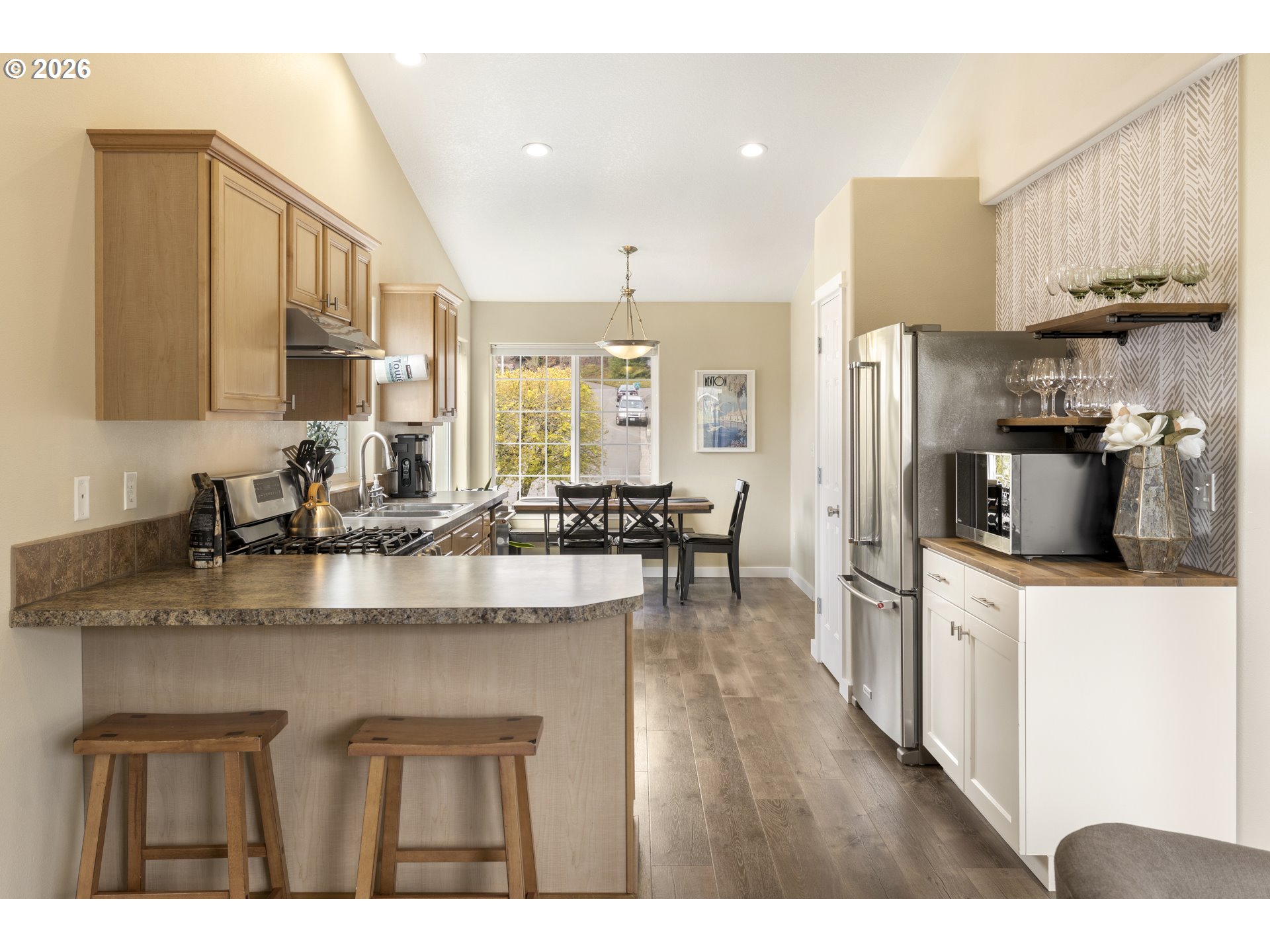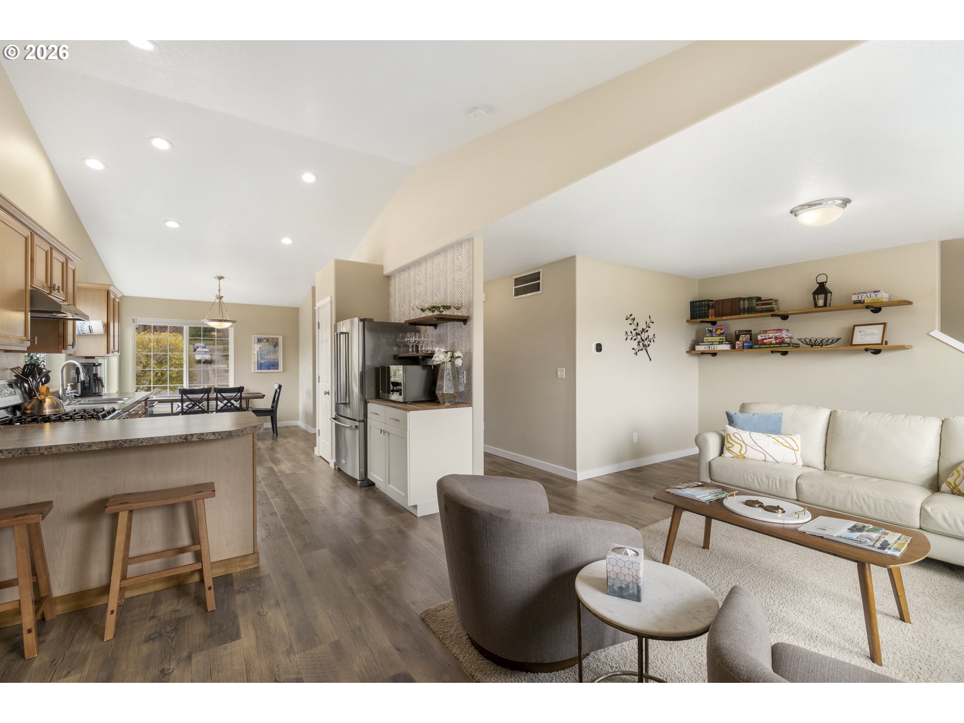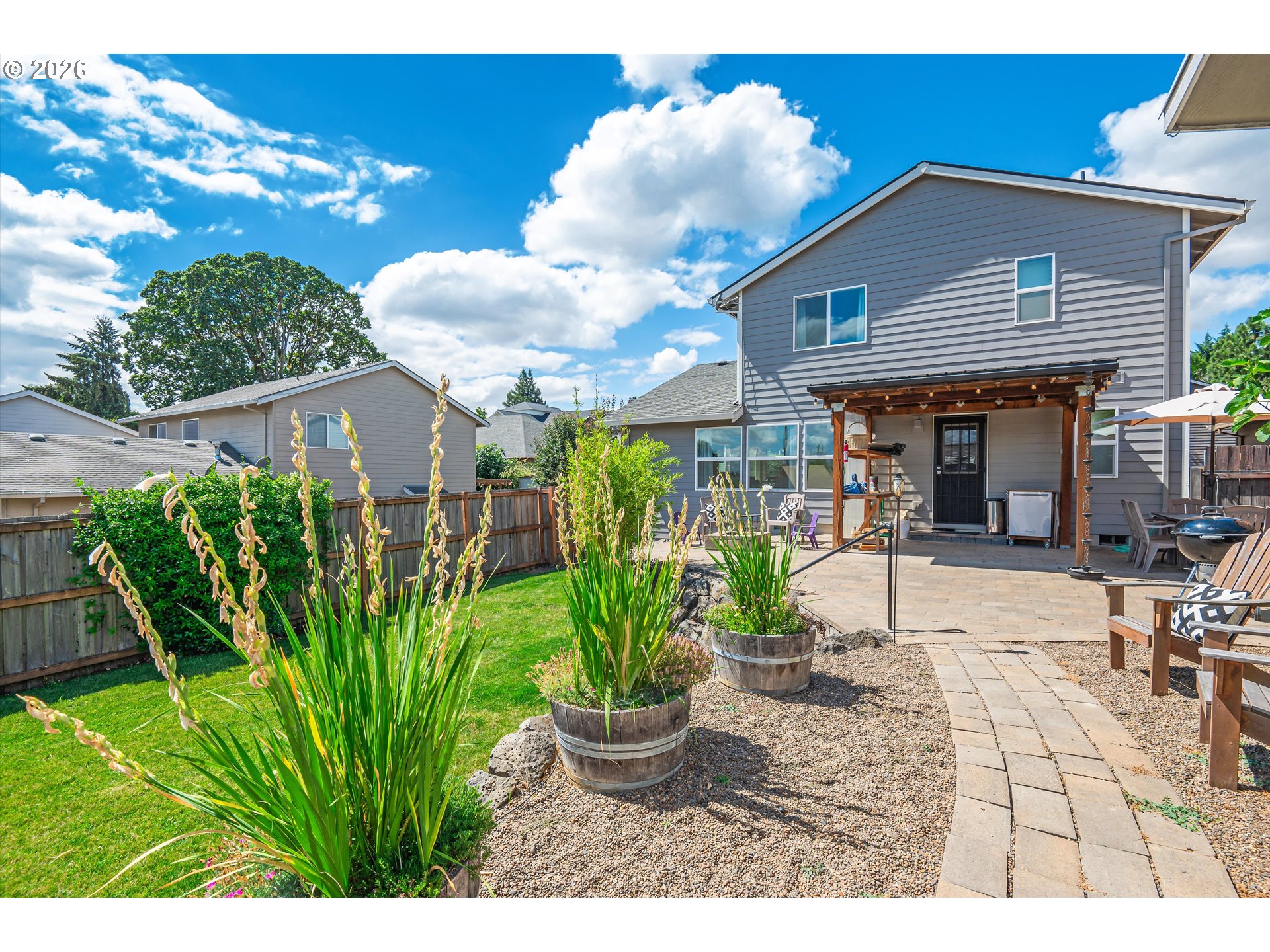 Tucked away on a quiet cul-de-sac in the heart of Dundee, this home offers comfortable living in a location that’s hard to beat. The open concept main level features laminate flooring throughout and a kitchen designed for both everyday living and easy entertaining. Vaulted ceilings add an airy feel, while stainless steel appliances, a gas range, dishwasher, and a spacious pantry make the kitchen both stylish and functional. The kitchen flows seamlessly into the great room where a corner gas fireplace and large windows bring in abundant natural light. Upstairs you’ll find three bedrooms, all with plush carpet and ceiling fans for year round comfort. The primary suite includes a private bath with a double sink vanity and walk in shower. Thoughtful upgrades add extra peace of mind, including a brand new roof and a full PEX repipe throughout the home. The electrical panel also features a generator transfer switch that allows backup power to key areas of the home during outages. Several smart home features can be controlled right from your phone, including the attic fan, four zone automatic sprinkler system, and the heating and cooling thermostat. Step outside and the backyard truly steals the show. Professionally landscaped and beautifully maintained, the space features an expansive paver patio, a built in firepit, and a detached shed that has been thoughtfully finished as a home office. The office includes its own mini split for heating and cooling, recessed lighting, high speed internet wiring, and a permitted subpanel, creating a comfortable and functional workspace just steps from the house. All of this just moments from Dundee’s renowned wineries, boutique restaurants, and tasting rooms, making it easy to enjoy the very best of wine country living.