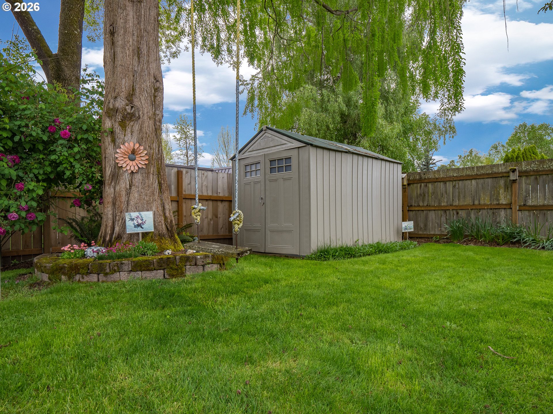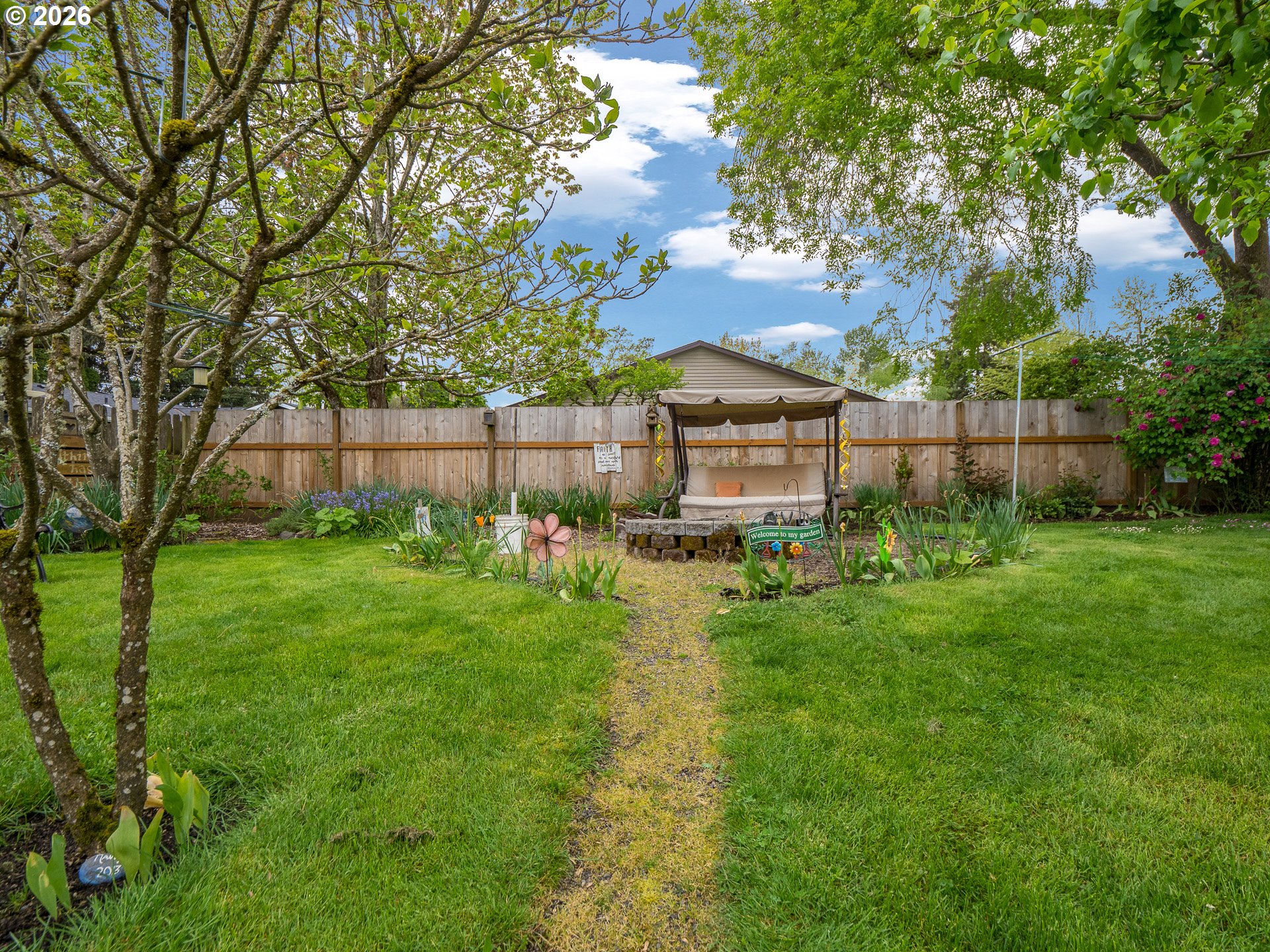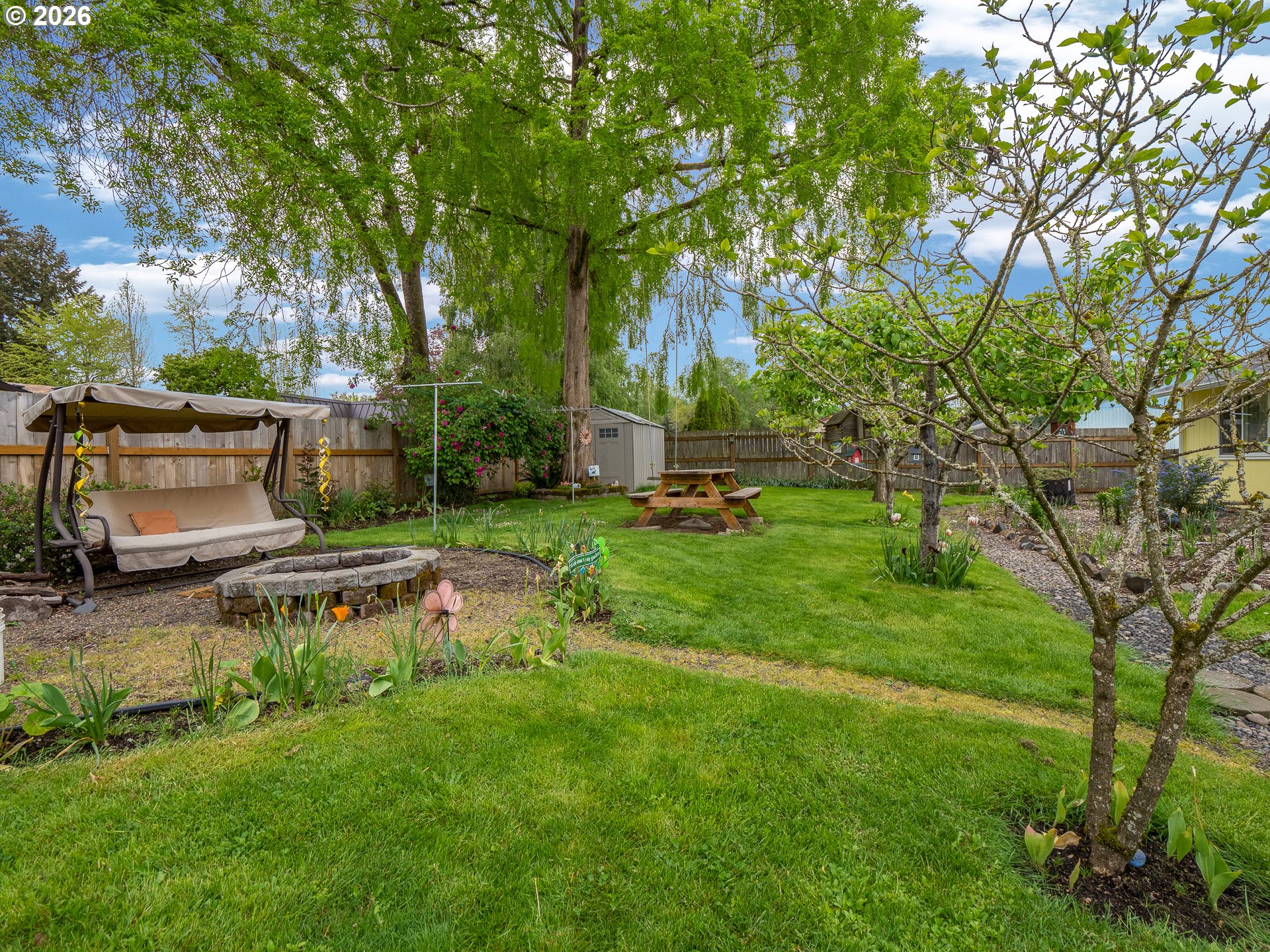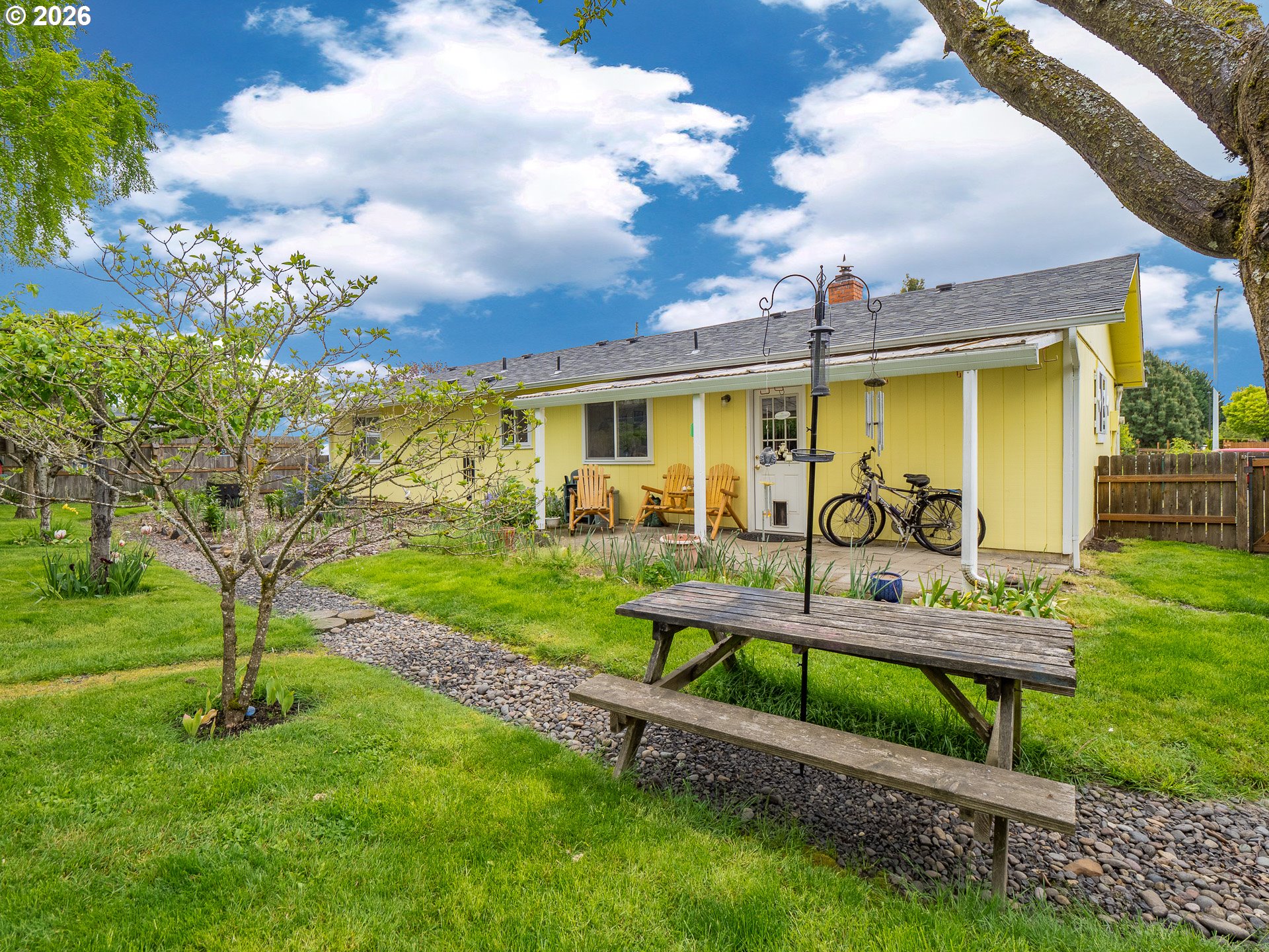Right in the heart of Oregon wine country, this thoughtfully updated single-level ranch keeps things simple, comfortable, and easy to love. A smart garage conversion creates a finished home office while still preserving space for storage, tools, or outdoor gear. Need a full garage again down the road? The option is there. Inside, laminate flooring runs throughout the home, creating a clean, cohesive feel, while a large picture window fills the living room with natural light. The kitchen has been refreshed with updated counters, sink, and backsplash, and the home is dialed in for everyday comfort with cadet heaters in every room, a high-rise toilet, and a walk-in shower with added grab bars. Recent improvements over the past three years include a new roof, gutters, double-pane windows, water heater, and backyard fencing, along with a new bathroom subfloor and flooring. Step outside and the space really opens up. A covered patio sets the stage for year-round use, while the gravel firepit area, firewood shelter, and walk-in storage shed add both function and charm. Mature trees provide shade across the yard, complemented by a large, established rose garden. A french drain system surrounds the home for added peace of mind. Connected and ready for modern living with Ziply Fiber already installed, this is a well-cared-for home that blends practical updates with relaxed wine country living.