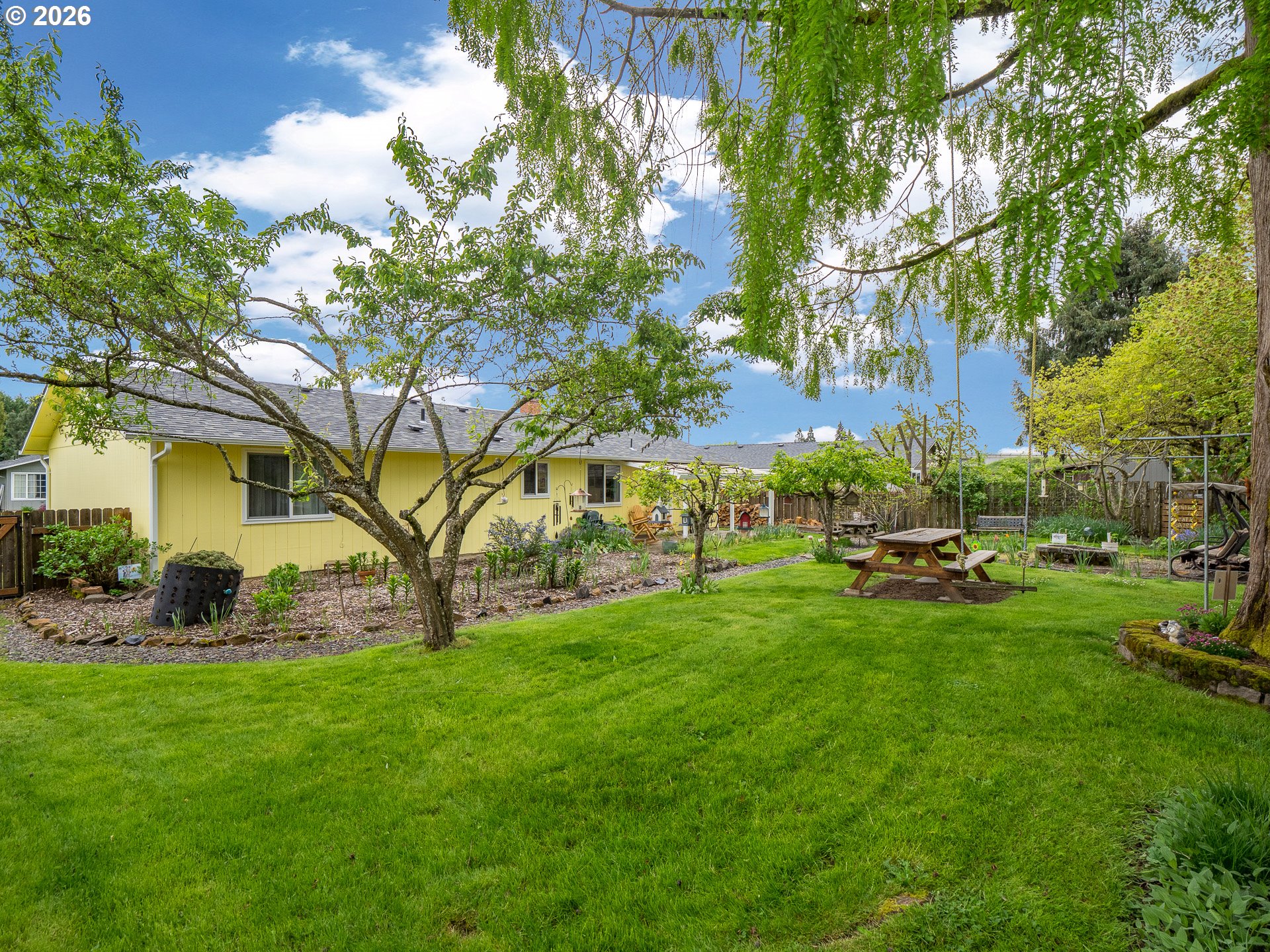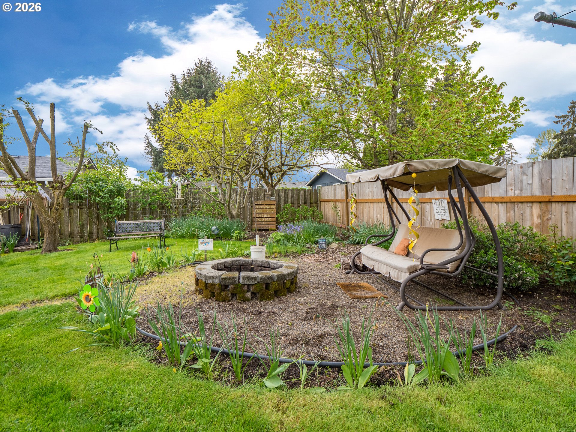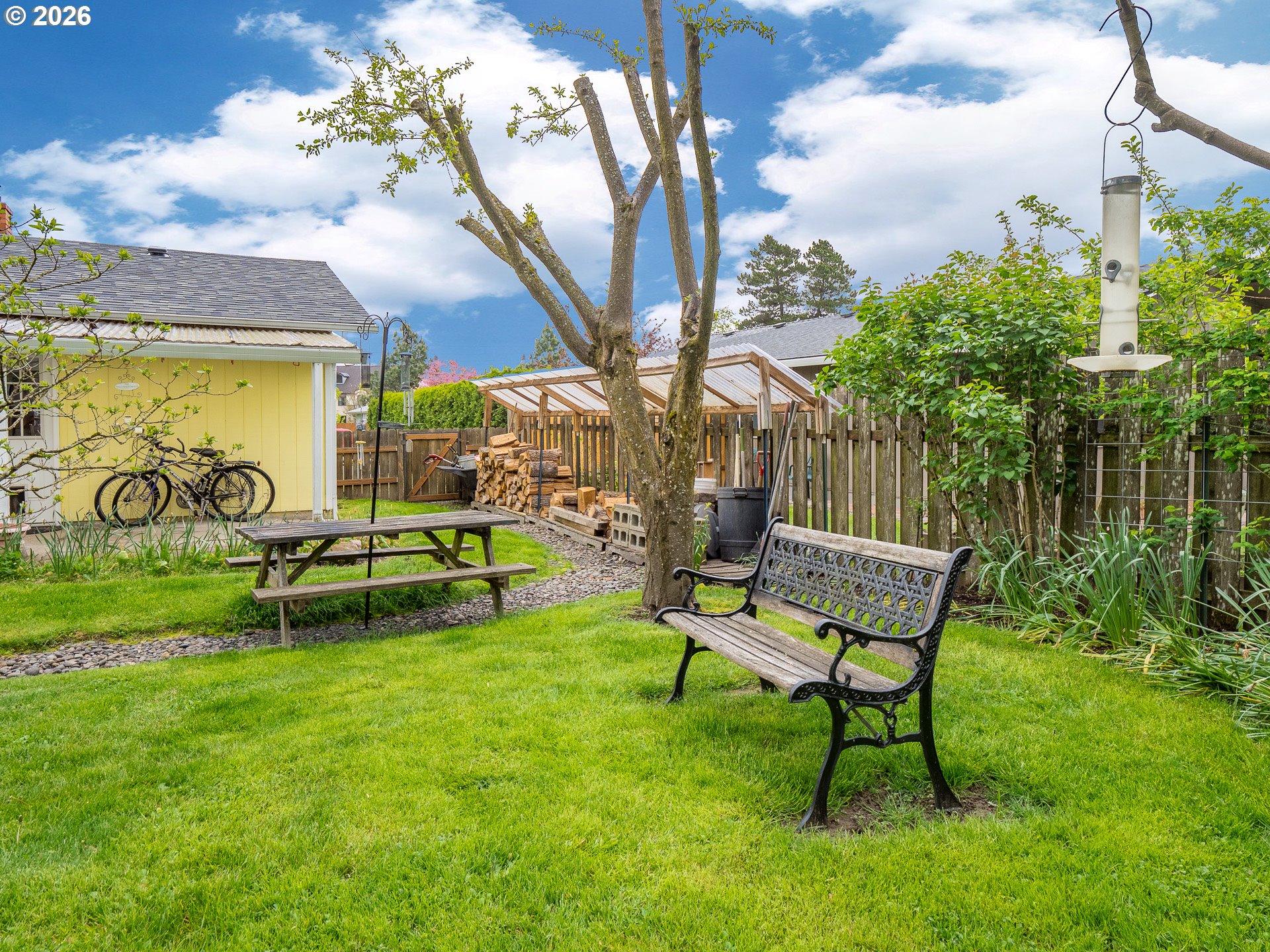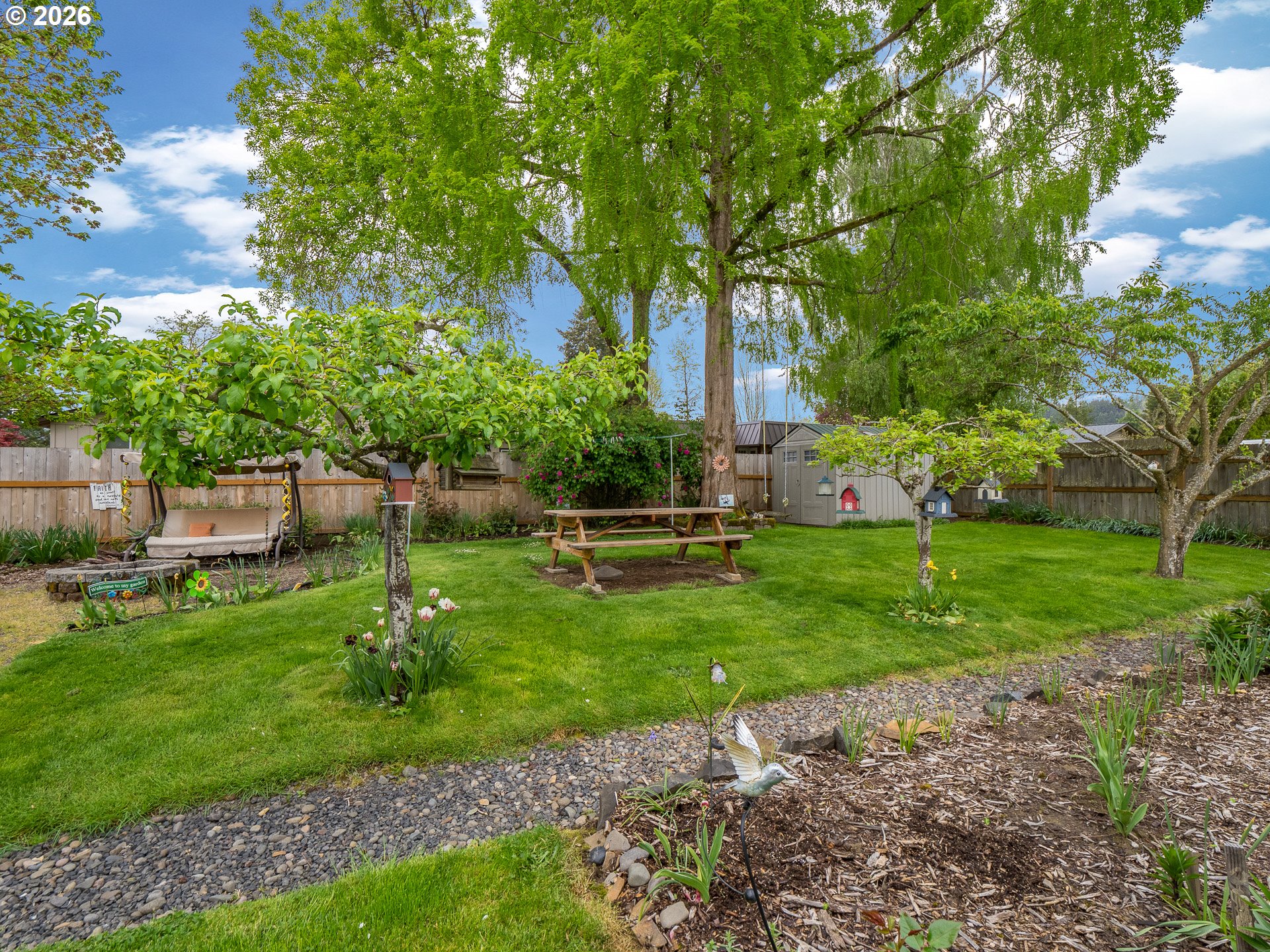 Right in the heart of Oregon wine country, this thoughtfully updated single-level ranch keeps things simple, comfortable, and easy to love. A smart garage conversion creates a finished home office while still preserving space for storage, tools, or outdoor gear. Need a full garage again down the road? The option is there. Inside, laminate flooring runs throughout the home, creating a clean, cohesive feel, while a large picture window fills the living room with natural light. The kitchen has been refreshed with updated counters, sink, and backsplash, and the home is dialed in for everyday comfort with cadet heaters in every room, a high-rise toilet, and a walk-in shower with added grab bars. Recent improvements over the past three years include a new roof, gutters, double-pane windows, water heater, and backyard fencing, along with a new bathroom subfloor and flooring. Step outside and the space really opens up. A covered patio sets the stage for year-round use, while the gravel firepit area, firewood shelter, and walk-in storage shed add both function and charm. Mature trees provide shade across the yard, complemented by a large, established rose garden. A french drain system surrounds the home for added peace of mind. Connected and ready for modern living with Ziply Fiber already installed, this is a well-cared-for home that blends practical updates with relaxed wine country living.