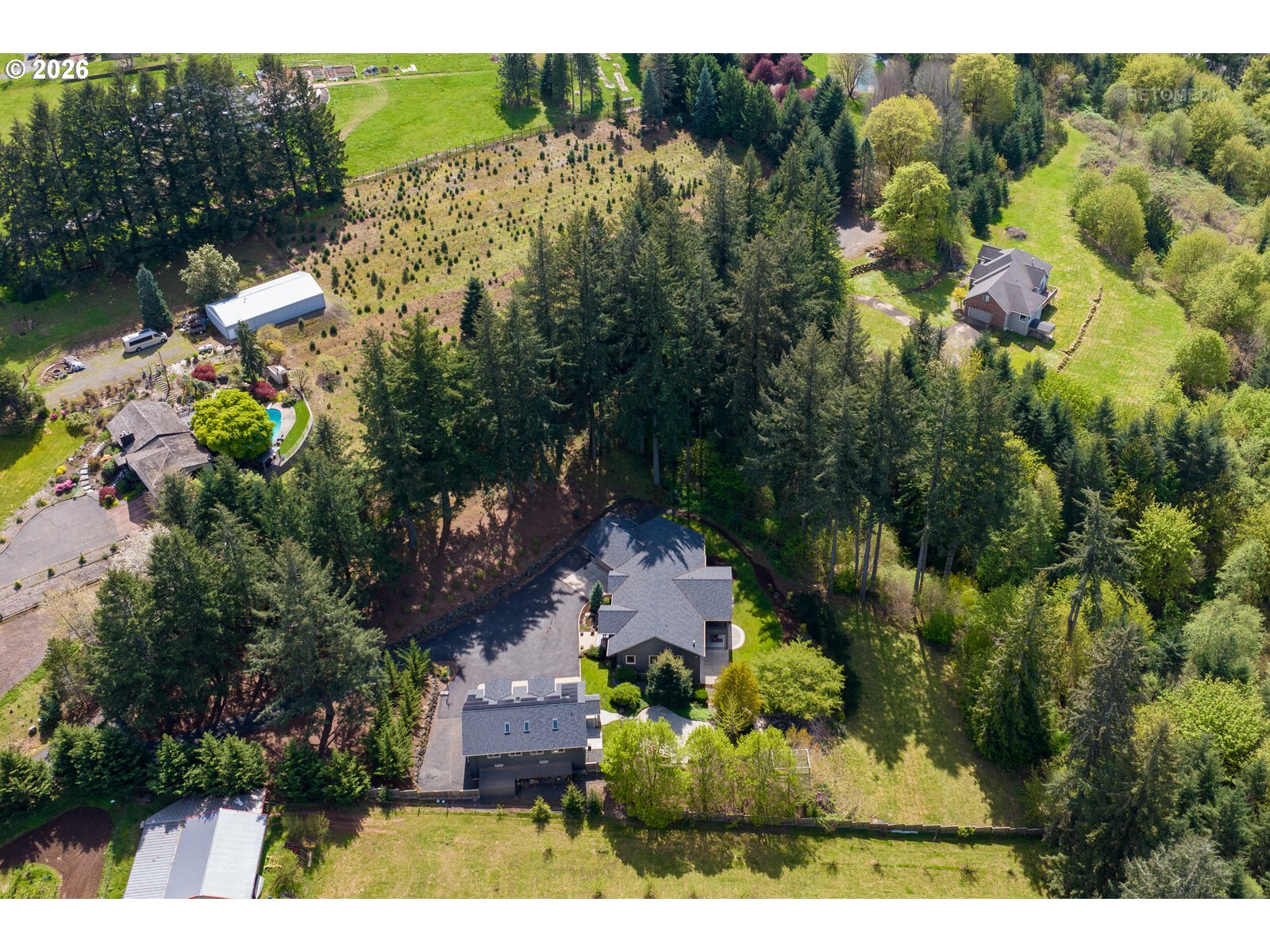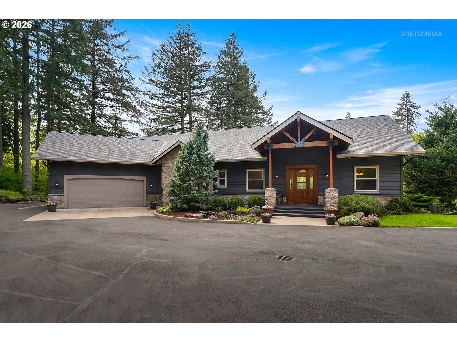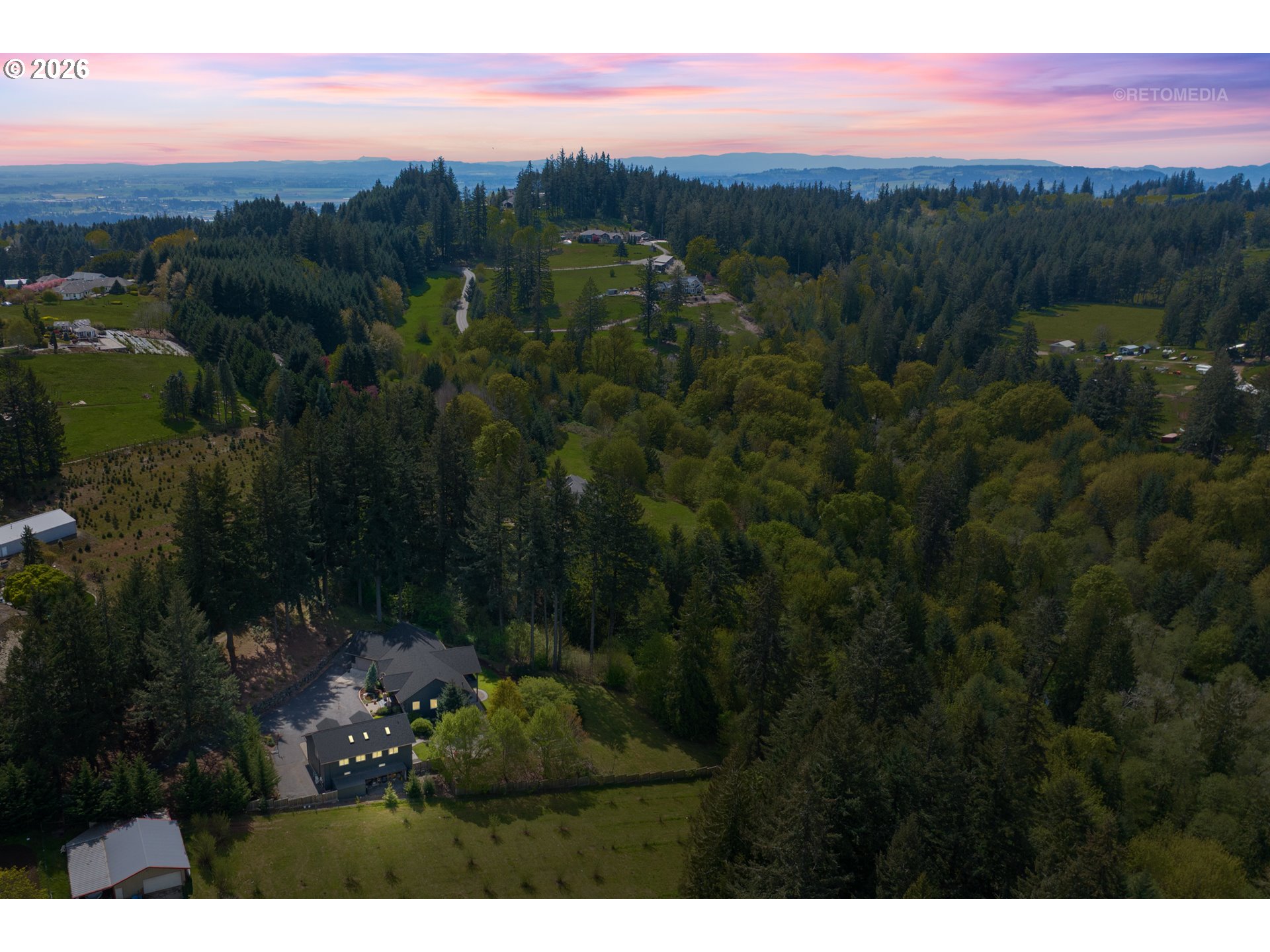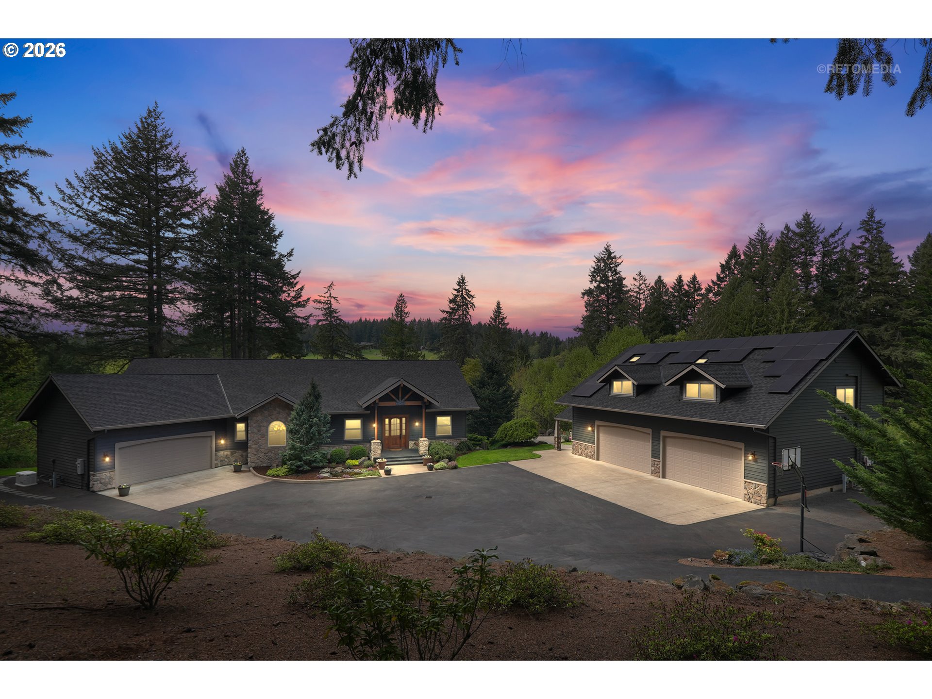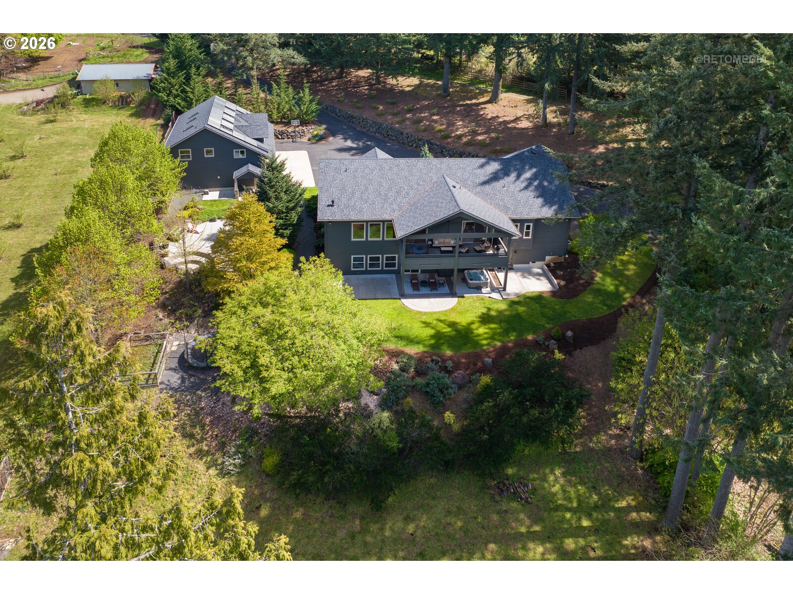 Close-in country estate, Sherwood School District, 6 bedrooms, primary bedroom on the main, 6 car garage, motorcourt, RV parking, detached guest house, and VIEW! And it's not too good to be true! This stunning setting in Sherwood Oregon's sought after wine country offers a perfect blend of luxury and natural beauty. Embellished in stone, natural tile, and warm wood accents, this architectural masterpiece boasts a magnificent floor plan designed to live well and entertain in style! Imagine tranquil moments on the back deck or front porch, surrounded by sky-reaching trees... warming up by the wind-sheltered fire-pit where the concrete radiates warmth while you take in the natural views all around you. It's incredible here! The property's top-quality architecture and finishes are evident throughout from the gourmet kitchen adorned with stone and tile accents, to the rich cabinetry and built-ins. The kitchen and dining room flow into the spacious living room with floor to ceiling fireplace and walls of windows that frame the views. You'll also find the primary bedroom on the main, and downstairs, a spacious family/bonus room providing additional space for relaxation, activities watching movies, hosting, and endless possibilities. The estate's expansive outdoor spaces are a testament to its thoughtful design, offering so much room for enjoyment and the captivating presence of nature and wildlife, including the serene ambiance and sound of trickling water from the nearby creek.The expansive driveway affords plenty of parking and play space, and the property's clever positioning lends to its grand appeal, offering the essence of endless nature, with less maintenance required. A detached garage with separate living quarters above rounds out the estate. The carriage house provides versatile options for guests or additional living space. *Square Footage, bedroom and bath quantified for main house and ADU reflecting total living space. A complete list of updates is on file.