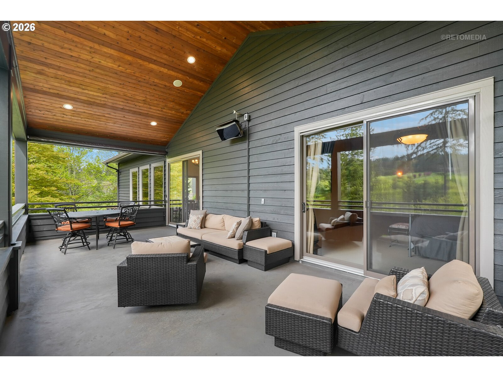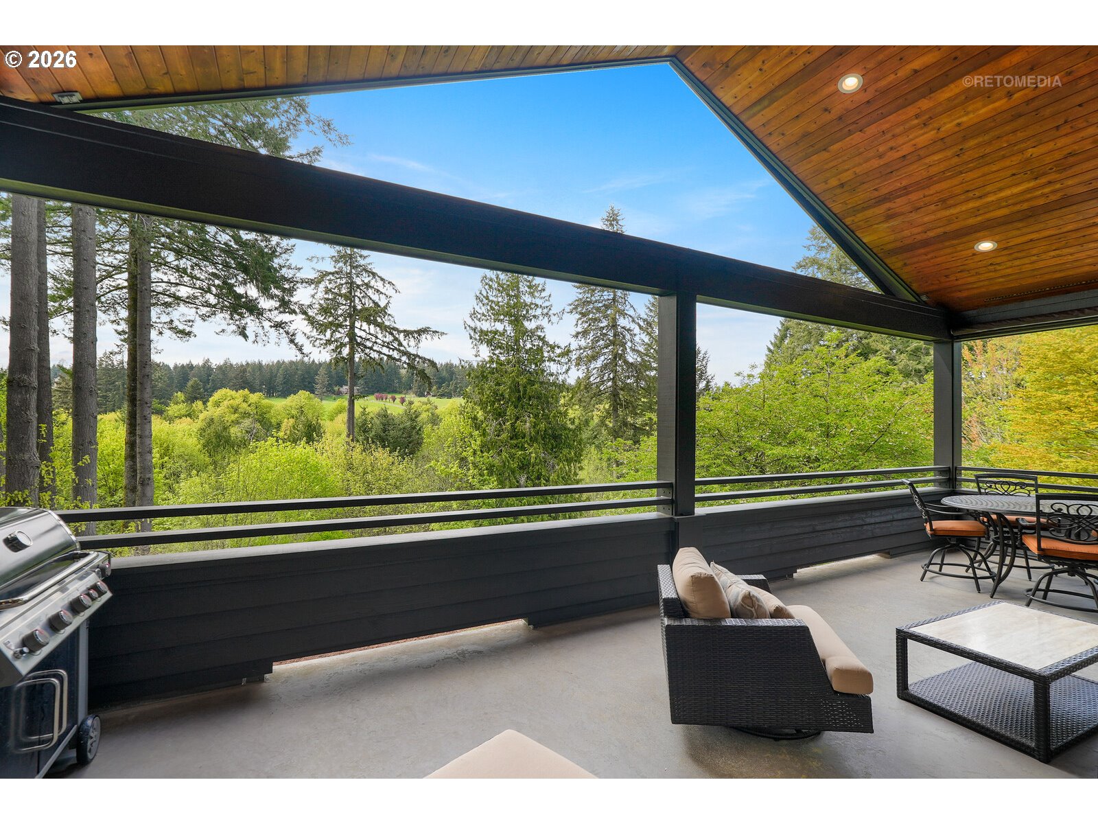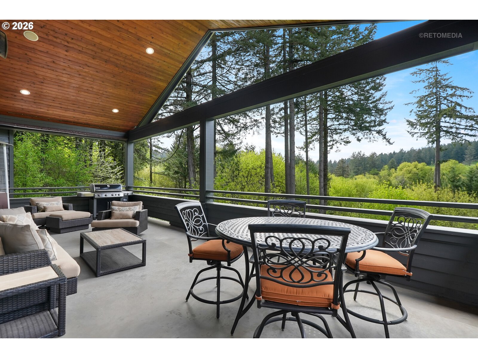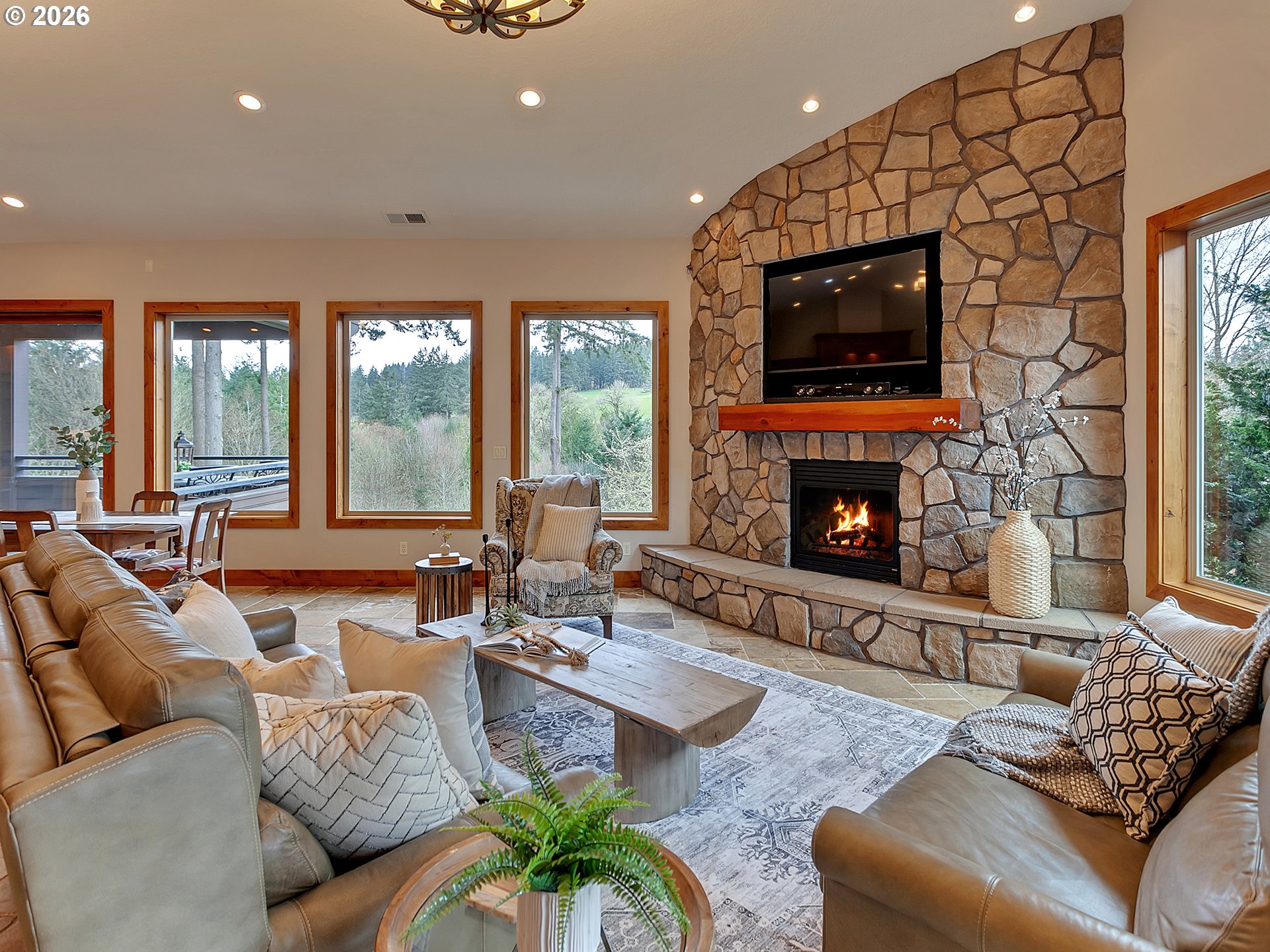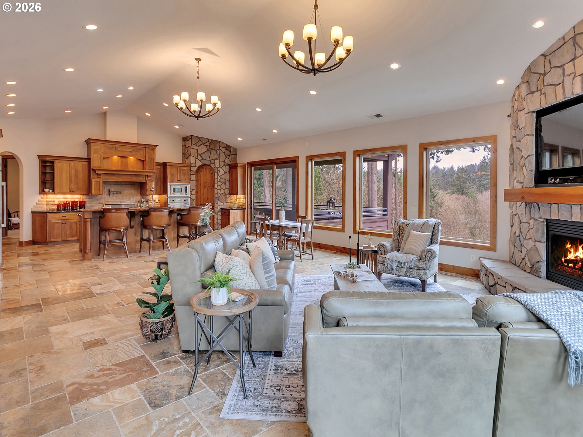Close-in country estate, Sherwood School District, 6 bedrooms, primary bedroom on the main, 6 car garage, motorcourt, RV parking, detached guest house, and VIEW! And it's not too good to be true! This stunning setting in Sherwood Oregon's sought after wine country offers a perfect blend of luxury and natural beauty. Embellished in stone, natural tile, and warm wood accents, this architectural masterpiece boasts a magnificent floor plan designed to live well and entertain in style! Imagine tranquil moments on the back deck or front porch, surrounded by sky-reaching trees... warming up by the wind-sheltered fire-pit where the concrete radiates warmth while you take in the natural views all around you. It's incredible here! The property's top-quality architecture and finishes are evident throughout from the gourmet kitchen adorned with stone and tile accents, to the rich cabinetry and built-ins. The kitchen and dining room flow into the spacious living room with floor to ceiling fireplace and walls of windows that frame the views. You'll also find the primary bedroom on the main, and downstairs, a spacious family/bonus room providing additional space for relaxation, activities watching movies, hosting, and endless possibilities. The estate's expansive outdoor spaces are a testament to its thoughtful design, offering so much room for enjoyment and the captivating presence of nature and wildlife, including the serene ambiance and sound of trickling water from the nearby creek.The expansive driveway affords plenty of parking and play space, and the property's clever positioning lends to its grand appeal, offering the essence of endless nature, with less maintenance required. A detached garage with separate living quarters above rounds out the estate. The carriage house provides versatile options for guests or additional living space. *Square Footage, bedroom and bath quantified for main house and ADU reflecting total living space. A complete list of updates is on file.