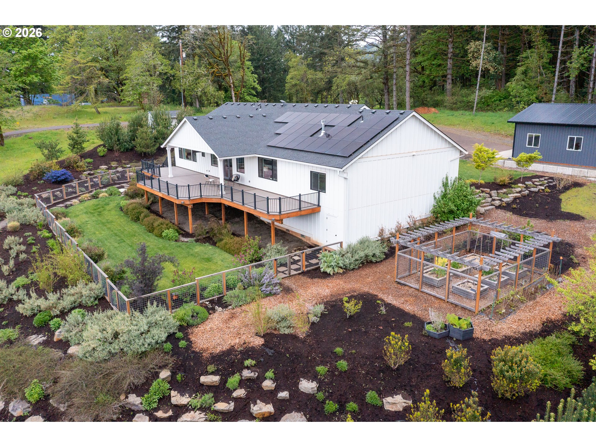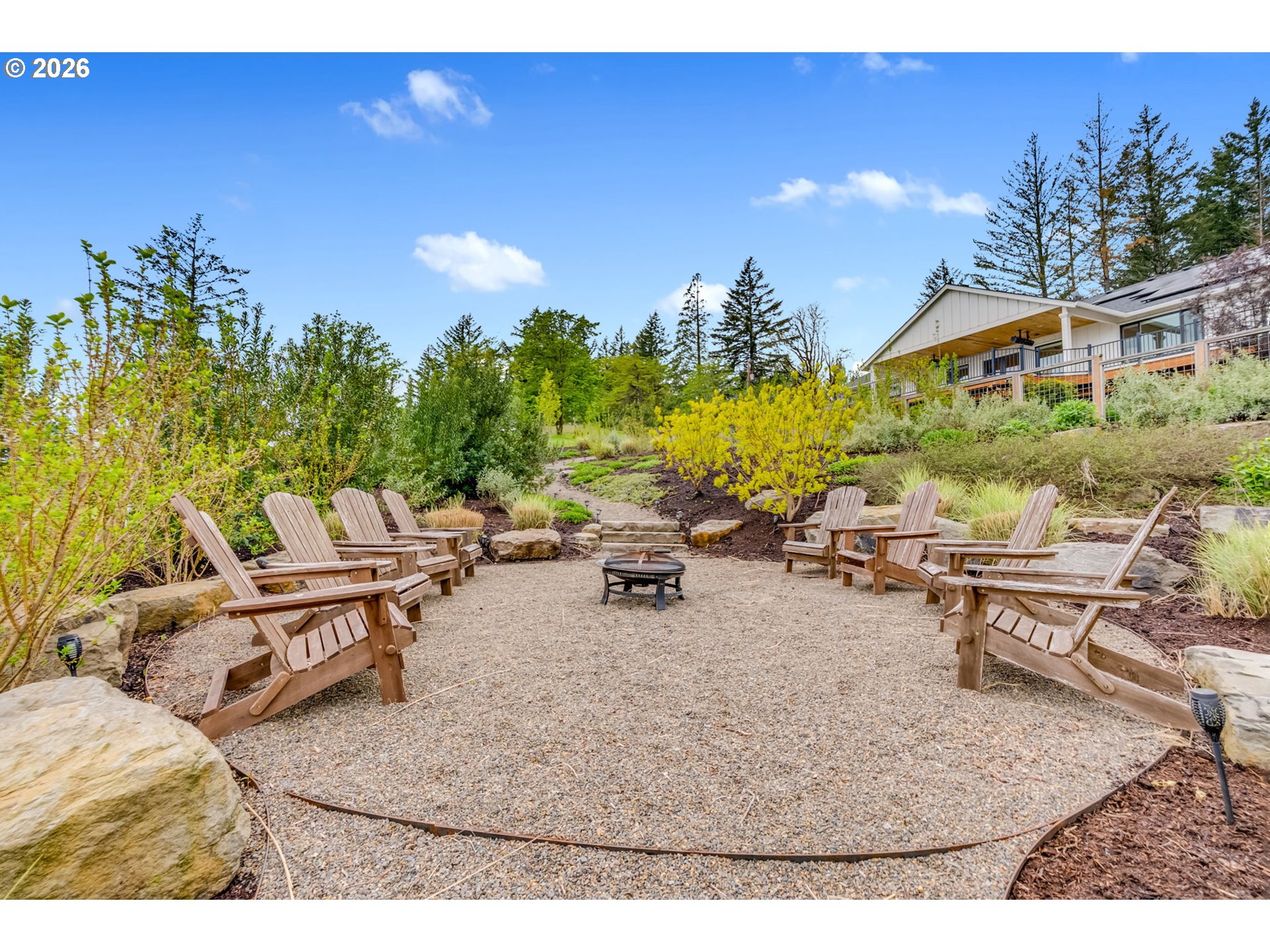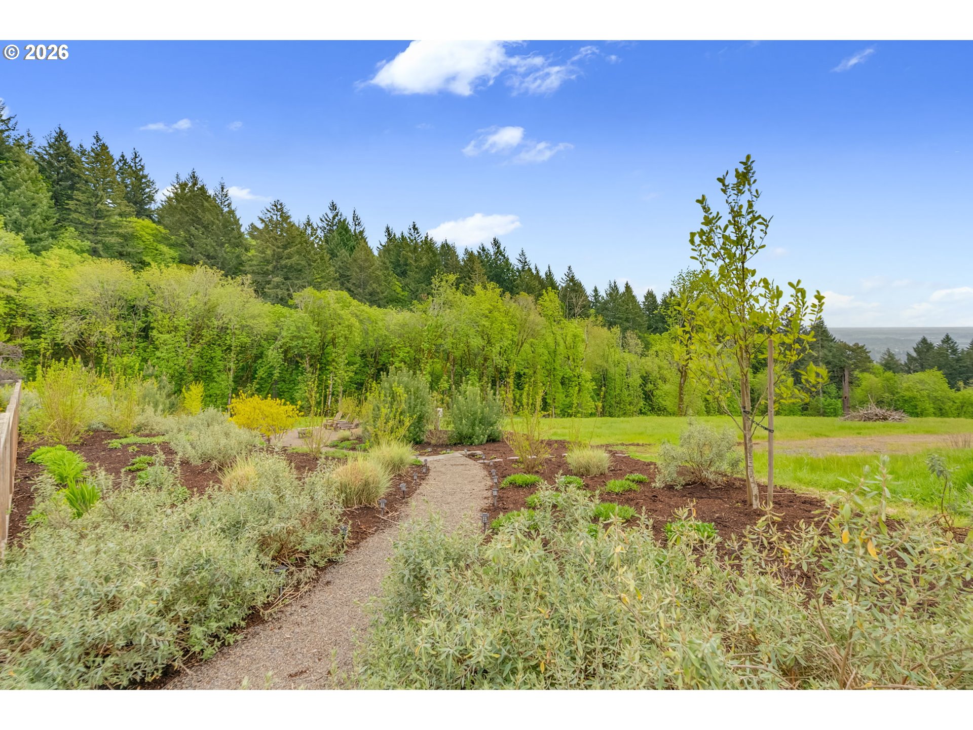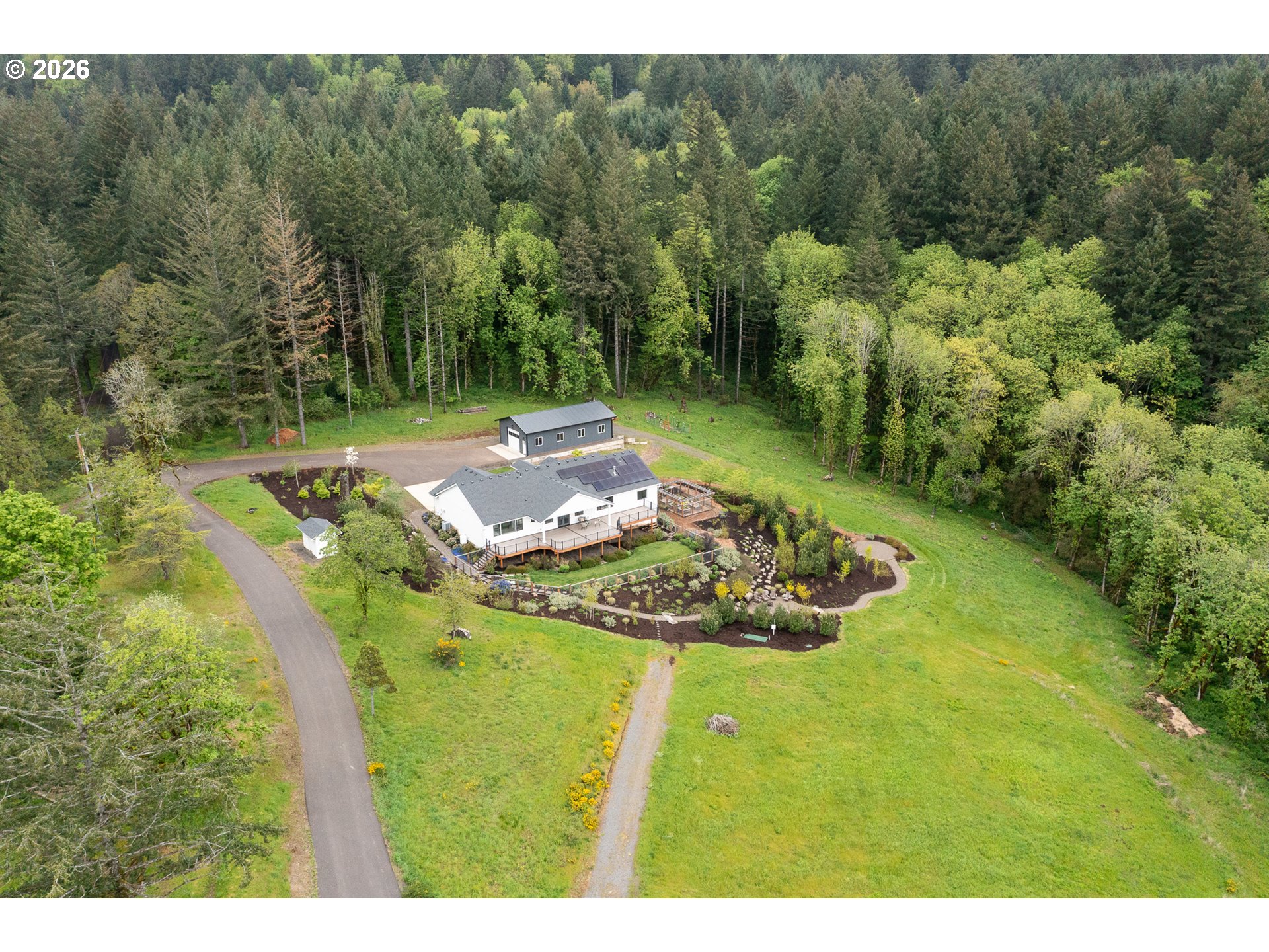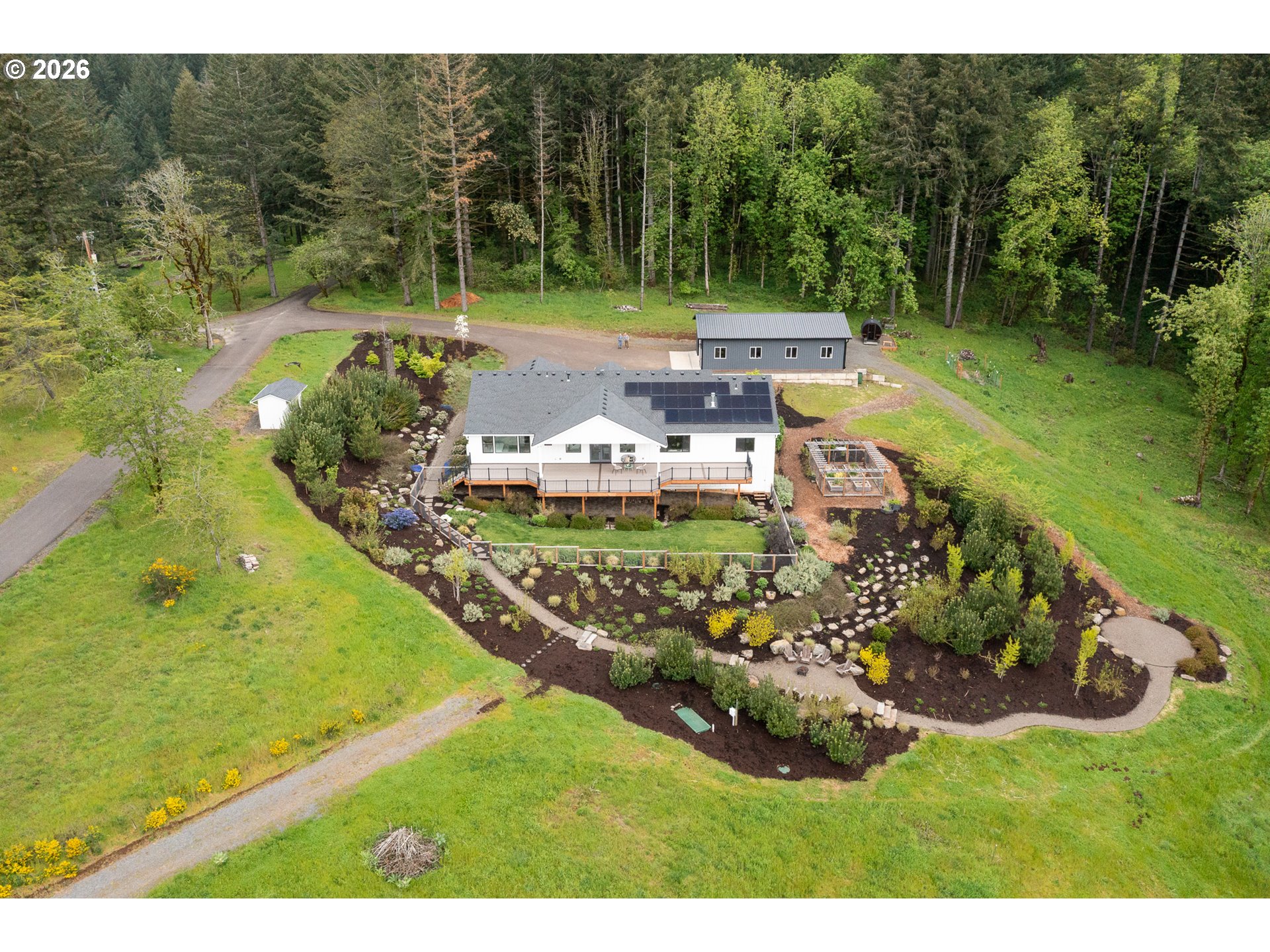 Set on just over four private acres in the heart of wine country, this exceptional estate offers luxury living surrounded by breathtaking natural beauty. A long, private lane winds through Douglas fir, vine maple, and sword fern, leading to a serene retreat with sweeping valley views. Abundant wildlife are frequent visitors, and a seasonal creek can be heard from the deck, enhancing the tranquil setting. Professionally designed native perennial gardens offer year-round interest, alongside a deer-fenced veggie garden—both fully irrigated with an app-controlled system. The balance of the property blends meadow and forest, creating a perfect mix of open space and privacy, with views and spectacular sunsets from nearly every vantage point. Inside, the single-level home is filled with natural light, with large windows that bring the outside in. The open-concept layout centers around a gourmet kitchen with a large island, Italian Bertazzoni range, quartz surfaces, tile accents, and abundant storage. The dining area opens through French doors to the deck, overlooking the gardens, meadow and views and featuring a covered, heated area for year-round use. The living room offers built-ins and a brick fireplace with hearth—an inviting space for gathering while enjoying the scenery beyond. The home offers 4 bedrooms plus a den, two full baths, and a half bath. The primary suite includes a walk-in closet and ensuite with a walk-in tiled shower. Custom blinds throughout—including programmable remote-controlled options—add both comfort and convenience. A fully insulated and climate-controlled shop (heat & AC) features 10-foot pull-through doors and a bath, perfect for hobbies or workspace. Solar panels with battery storage provide approximately 77% of the home’s annual energy needs, enhancing efficiency and sustainability. Located near some of Oregon’s most celebrated wineries, this exceptional property offers refined living surrounded by nature, privacy, and panoramic views.