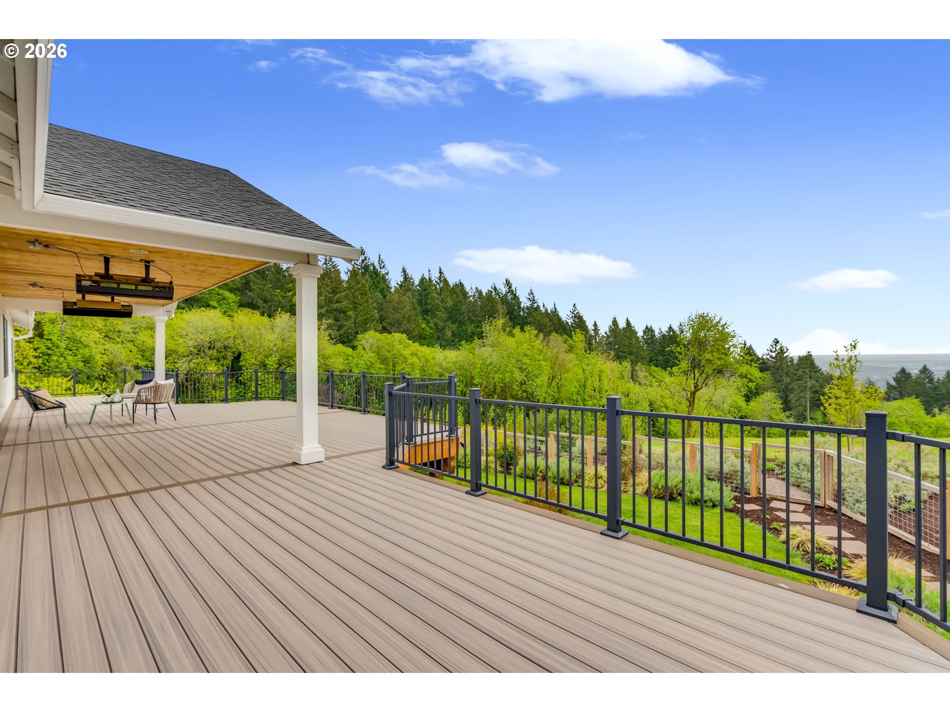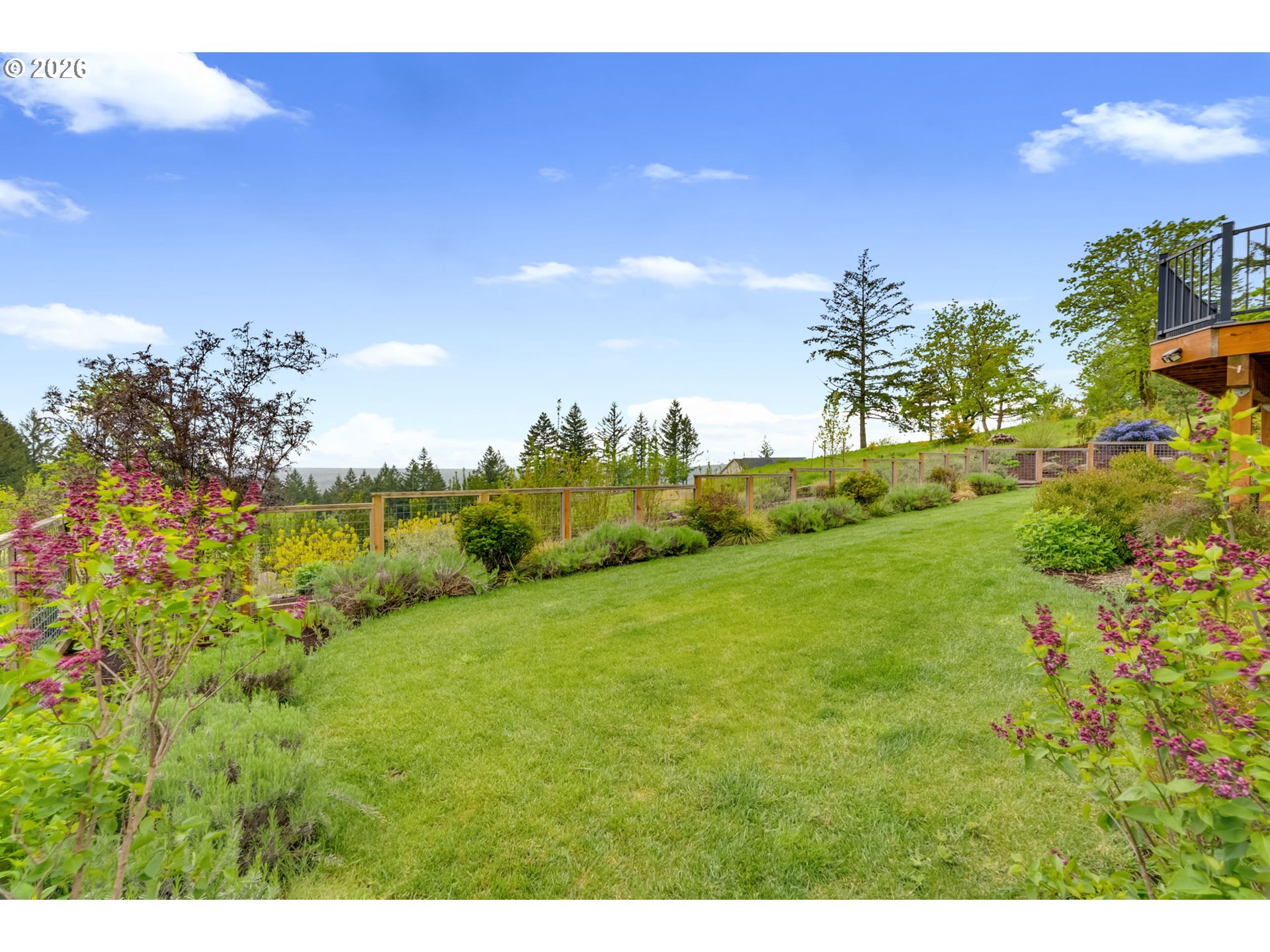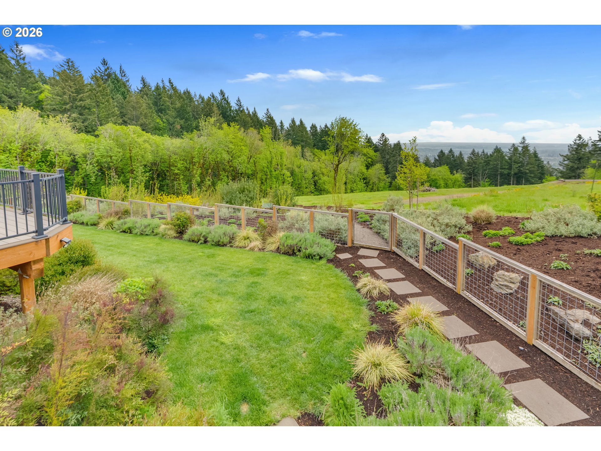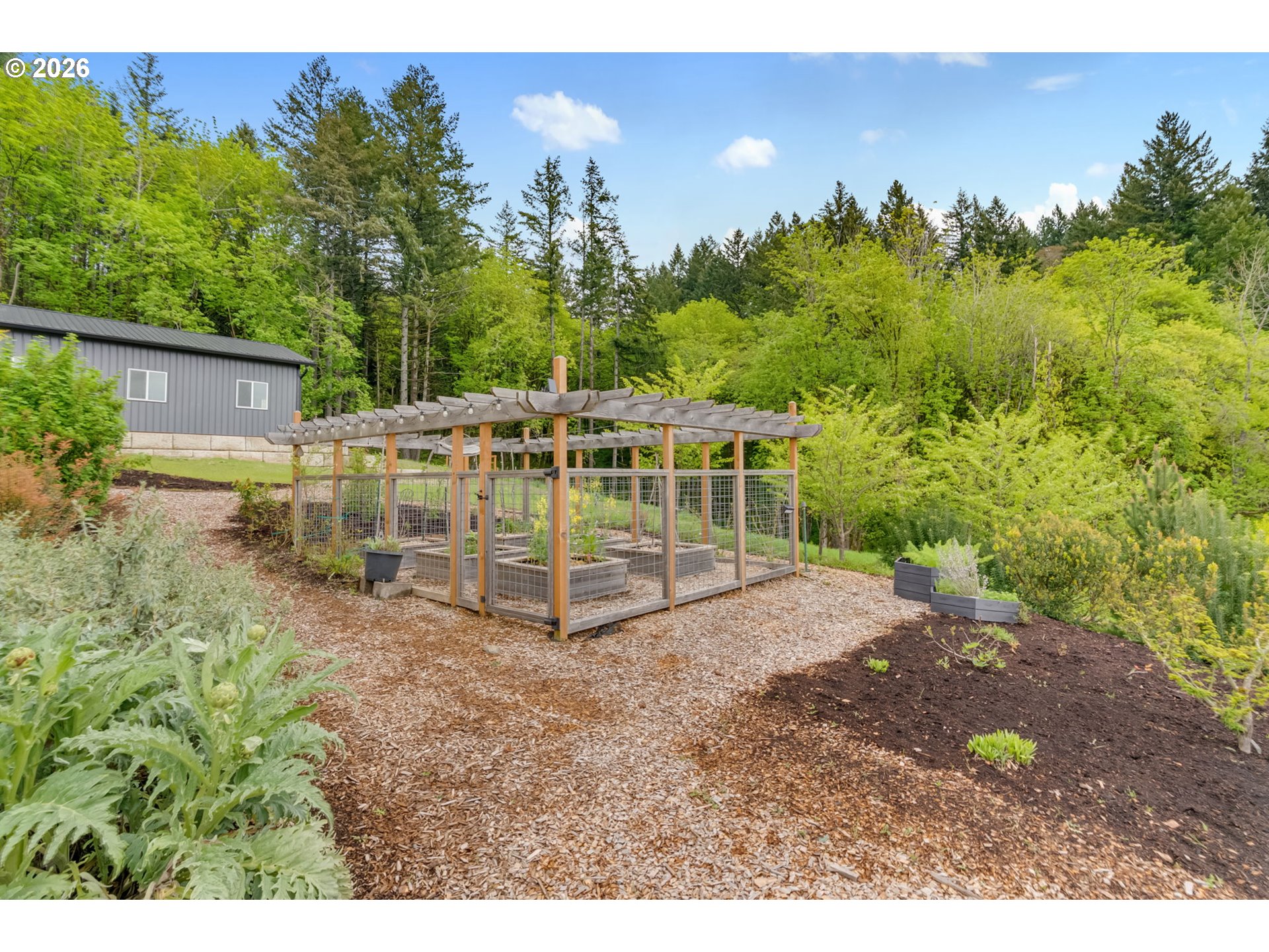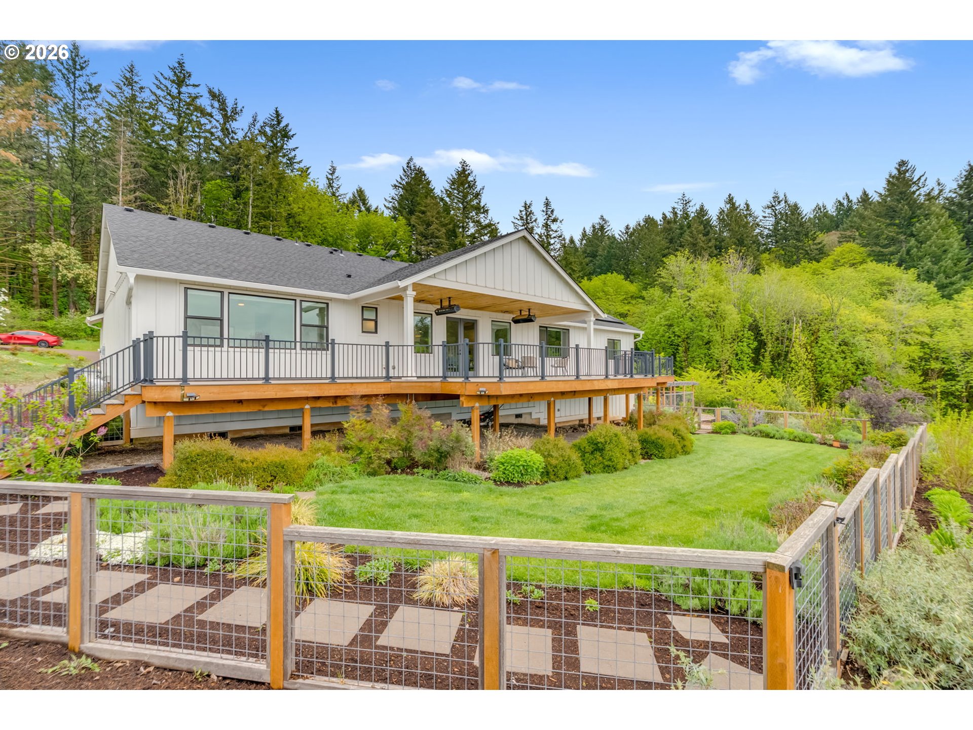 Set on just over four private acres in the heart of wine country, this exceptional estate offers luxury living surrounded by breathtaking natural beauty. A long, private lane winds through Douglas fir, vine maple, and sword fern, leading to a serene retreat with sweeping valley views. Abundant wildlife are frequent visitors, and a seasonal creek can be heard from the deck, enhancing the tranquil setting. Professionally designed native perennial gardens offer year-round interest, alongside a deer-fenced veggie garden—both fully irrigated with an app-controlled system. The balance of the property blends meadow and forest, creating a perfect mix of open space and privacy, with views and spectacular sunsets from nearly every vantage point. Inside, the single-level home is filled with natural light, with large windows that bring the outside in. The open-concept layout centers around a gourmet kitchen with a large island, Italian Bertazzoni range, quartz surfaces, tile accents, and abundant storage. The dining area opens through French doors to the deck, overlooking the gardens, meadow and views and featuring a covered, heated area for year-round use. The living room offers built-ins and a brick fireplace with hearth—an inviting space for gathering while enjoying the scenery beyond. The home offers 4 bedrooms plus a den, two full baths, and a half bath. The primary suite includes a walk-in closet and ensuite with a walk-in tiled shower. Custom blinds throughout—including programmable remote-controlled options—add both comfort and convenience. A fully insulated and climate-controlled shop (heat & AC) features 10-foot pull-through doors and a bath, perfect for hobbies or workspace. Solar panels with battery storage provide approximately 77% of the home’s annual energy needs, enhancing efficiency and sustainability. Located near some of Oregon’s most celebrated wineries, this exceptional property offers refined living surrounded by nature, privacy, and panoramic views.
