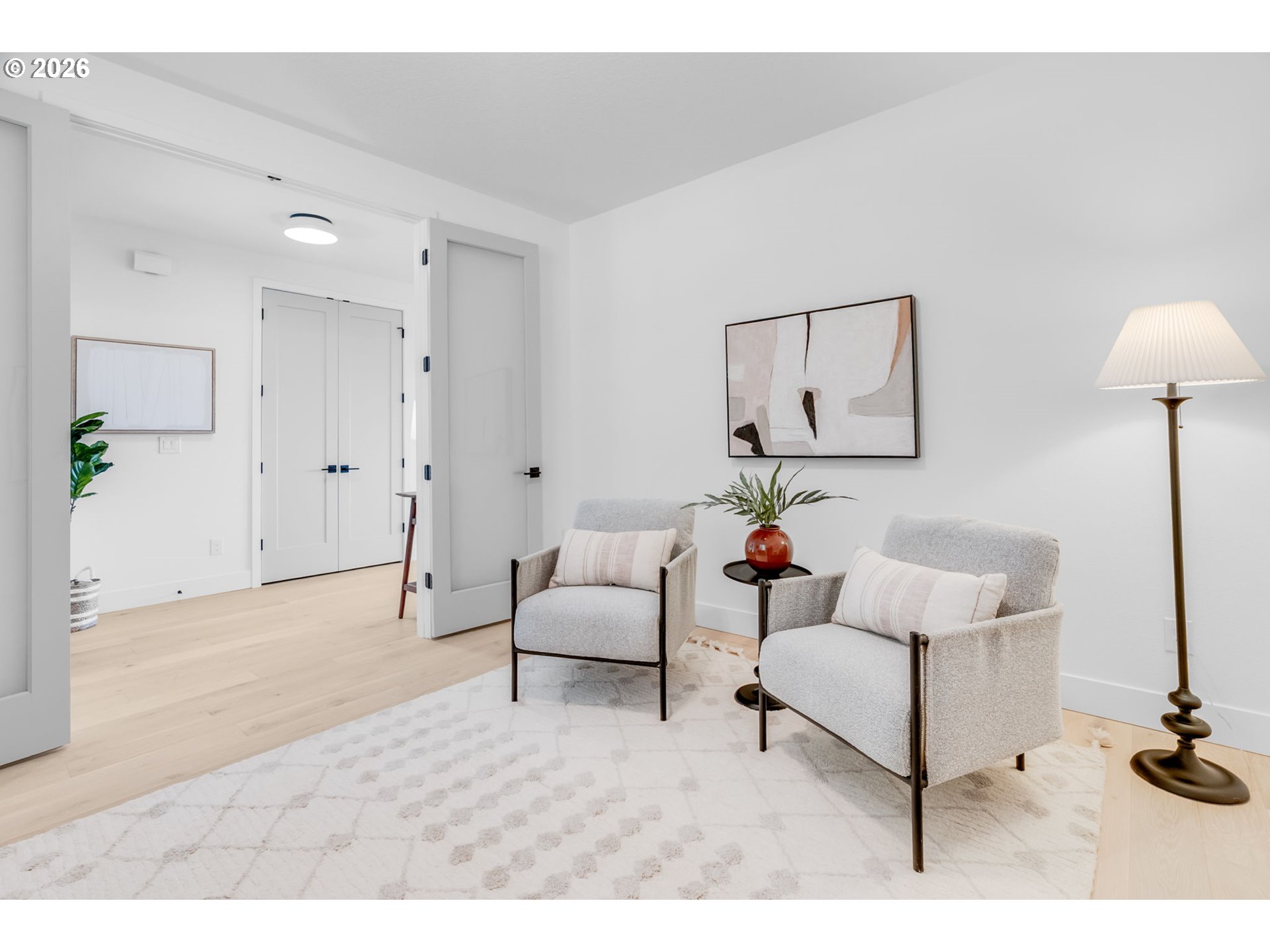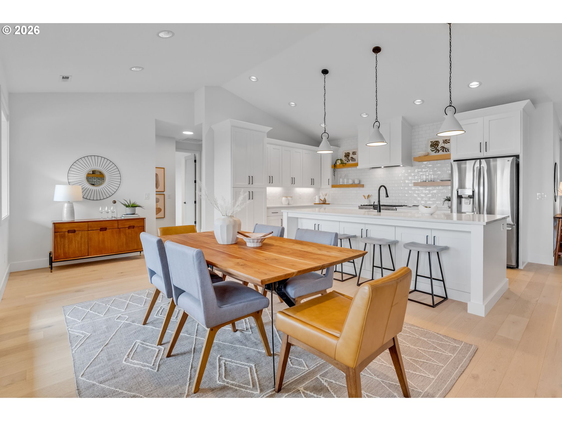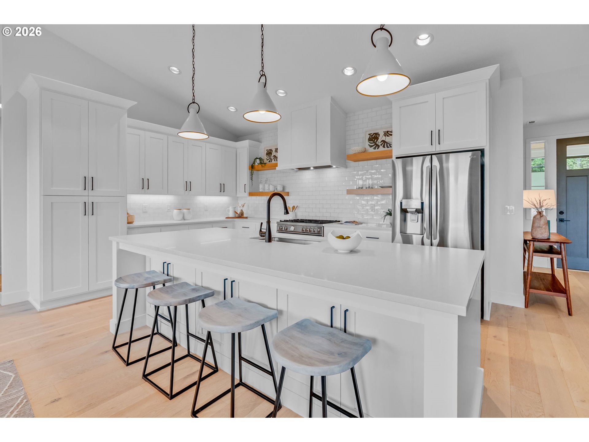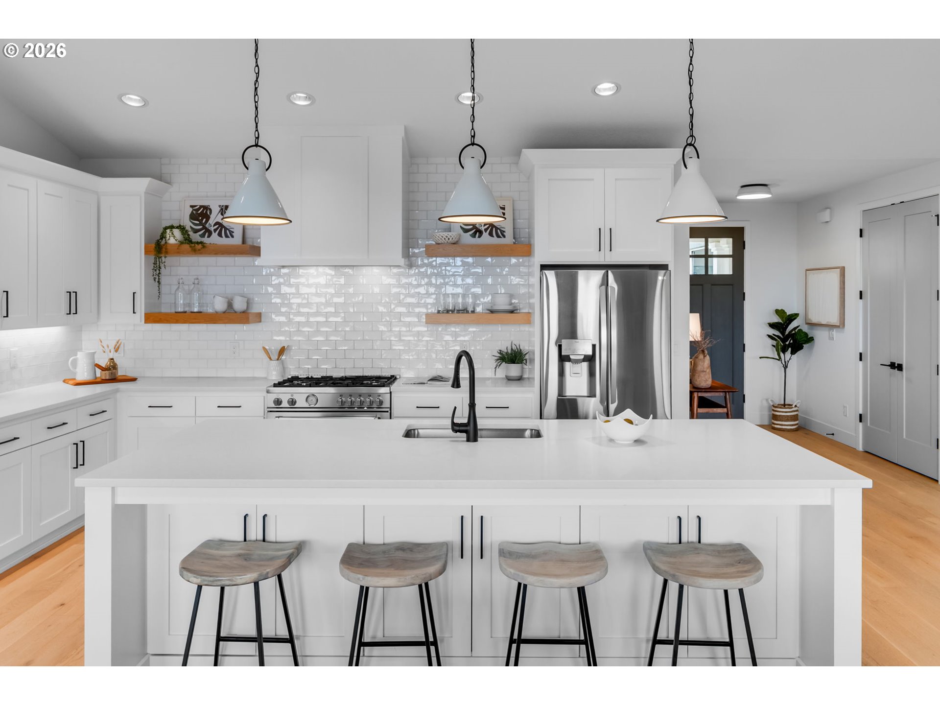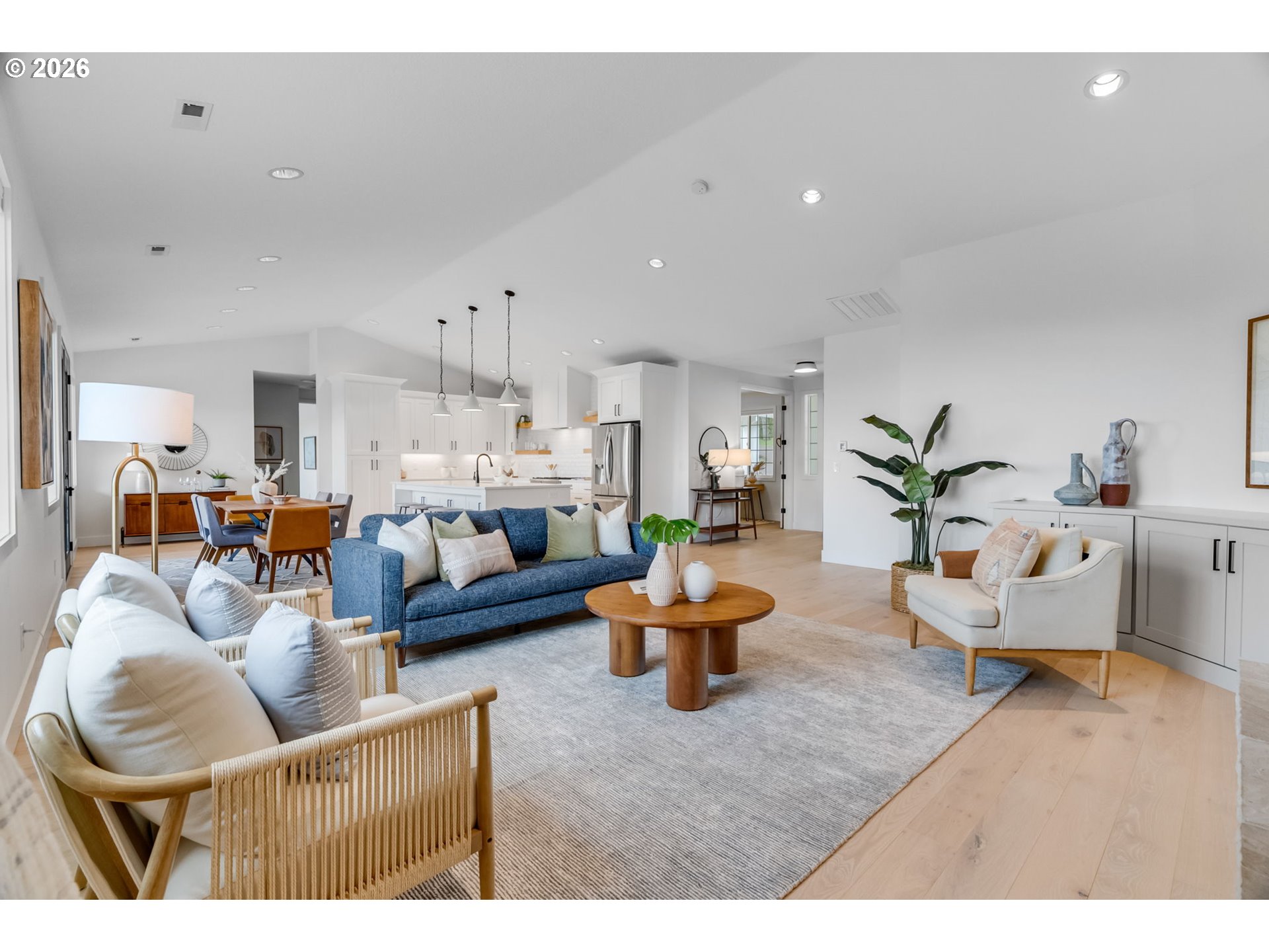 Set on just over four private acres in the heart of wine country, this exceptional estate offers luxury living surrounded by breathtaking natural beauty. A long, private lane winds through Douglas fir, vine maple, and sword fern, leading to a serene retreat with sweeping valley views. Abundant wildlife are frequent visitors, and a seasonal creek can be heard from the deck, enhancing the tranquil setting. Professionally designed native perennial gardens offer year-round interest, alongside a deer-fenced veggie garden—both fully irrigated with an app-controlled system. The balance of the property blends meadow and forest, creating a perfect mix of open space and privacy, with views and spectacular sunsets from nearly every vantage point. Inside, the single-level home is filled with natural light, with large windows that bring the outside in. The open-concept layout centers around a gourmet kitchen with a large island, Italian Bertazzoni range, quartz surfaces, tile accents, and abundant storage. The dining area opens through French doors to the deck, overlooking the gardens, meadow and views and featuring a covered, heated area for year-round use. The living room offers built-ins and a brick fireplace with hearth—an inviting space for gathering while enjoying the scenery beyond. The home offers 4 bedrooms plus a den, two full baths, and a half bath. The primary suite includes a walk-in closet and ensuite with a walk-in tiled shower. Custom blinds throughout—including programmable remote-controlled options—add both comfort and convenience. A fully insulated and climate-controlled shop (heat & AC) features 10-foot pull-through doors and a bath, perfect for hobbies or workspace. Solar panels with battery storage provide approximately 77% of the home’s annual energy needs, enhancing efficiency and sustainability. Located near some of Oregon’s most celebrated wineries, this exceptional property offers refined living surrounded by nature, privacy, and panoramic views.