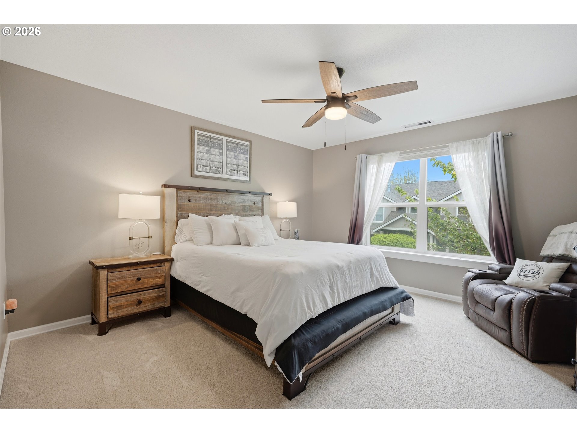 Enjoy stunning sunset views from the front porch of this light-filled 2 bedroom, 2.5 bath townhome. The open great room layout creates a spacious and inviting feel, complemented by 9-foot ceilings on the main level. Hardwood floors run through the entry, powder room, kitchen, and generous dining area. The kitchen features slab granite countertops, a tile backsplash, stainless steel appliances, and a convenient pantry. Upstairs, the primary suite offers a walk-in closet, a private bath with double sinks and a walk-in shower. Additional highlights include air conditioning and a comfortable back patio that features a new fence and gate that now allows access to the side yard and out to the back street!