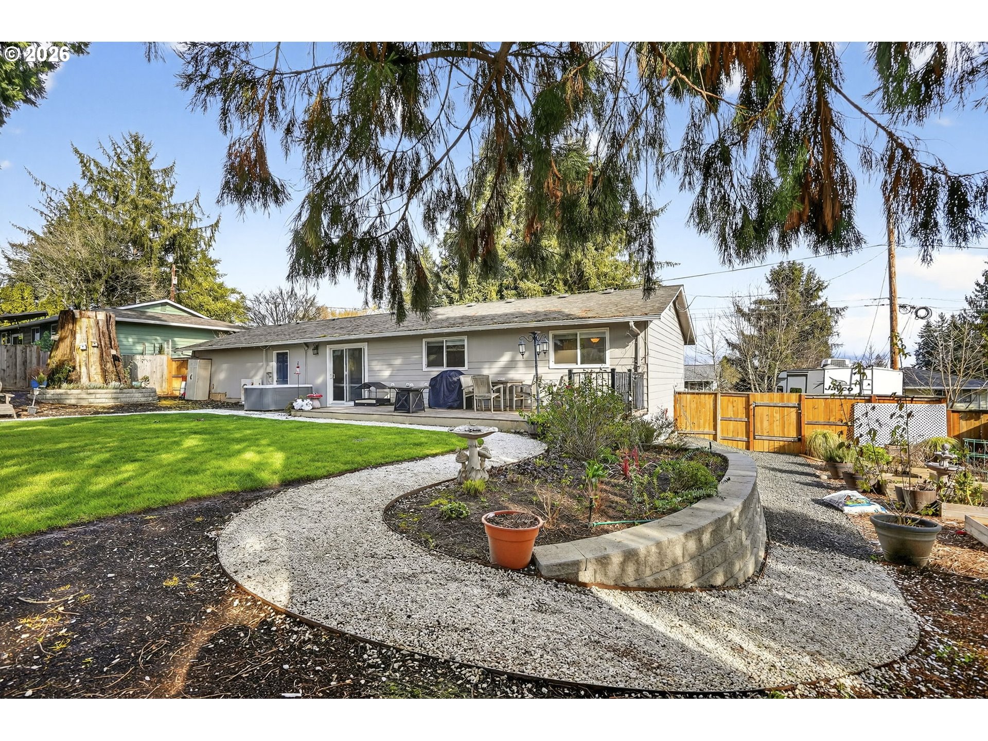 Exceptional opportunity to own a beautifully updated single level home! Thoughtfully upgraded throughout, this move-in-ready property features a newer roof, gutters and windows for added peace of mind. The stylish kitchen showcases quartz countertops, stainless steel appliances, and a modern tile backsplash, creating a warm and functional space for everyday living and entertaining. Newer interior and exterior paint, upgraded laminate flooring throughout, and efficient ductless heating and A/C. Step outside through the sliding glass doors to a spacious composite deck overlooking a beautifully designed backyard retreat. Crushed granite walking paths wind throughout the yard, creating a charming and low-maintenance landscape that’s both functional and inviting. The generous, fully fenced space offers exceptional privacy along with a well defined garden area featuring ample room for raised beds, planting boxes, or even a small greenhouse. This backyard offers endless possibilities for relaxation and outdoor living. This property is truly turnkey and ready for its next owner. Hot tub included!