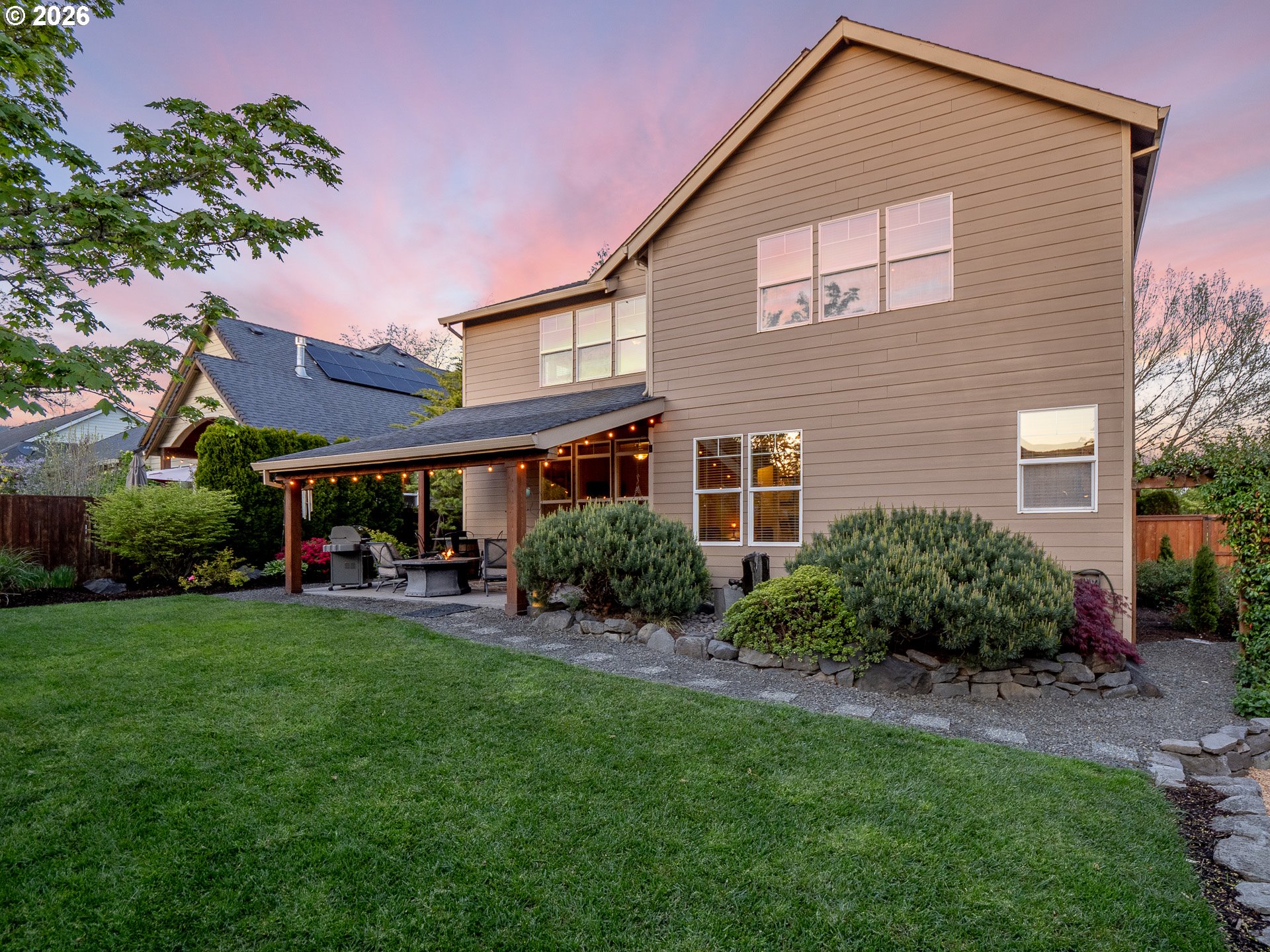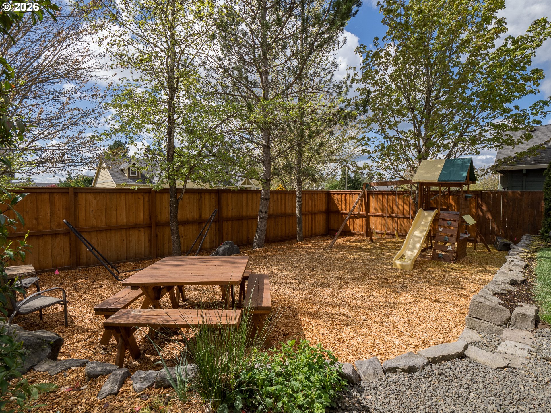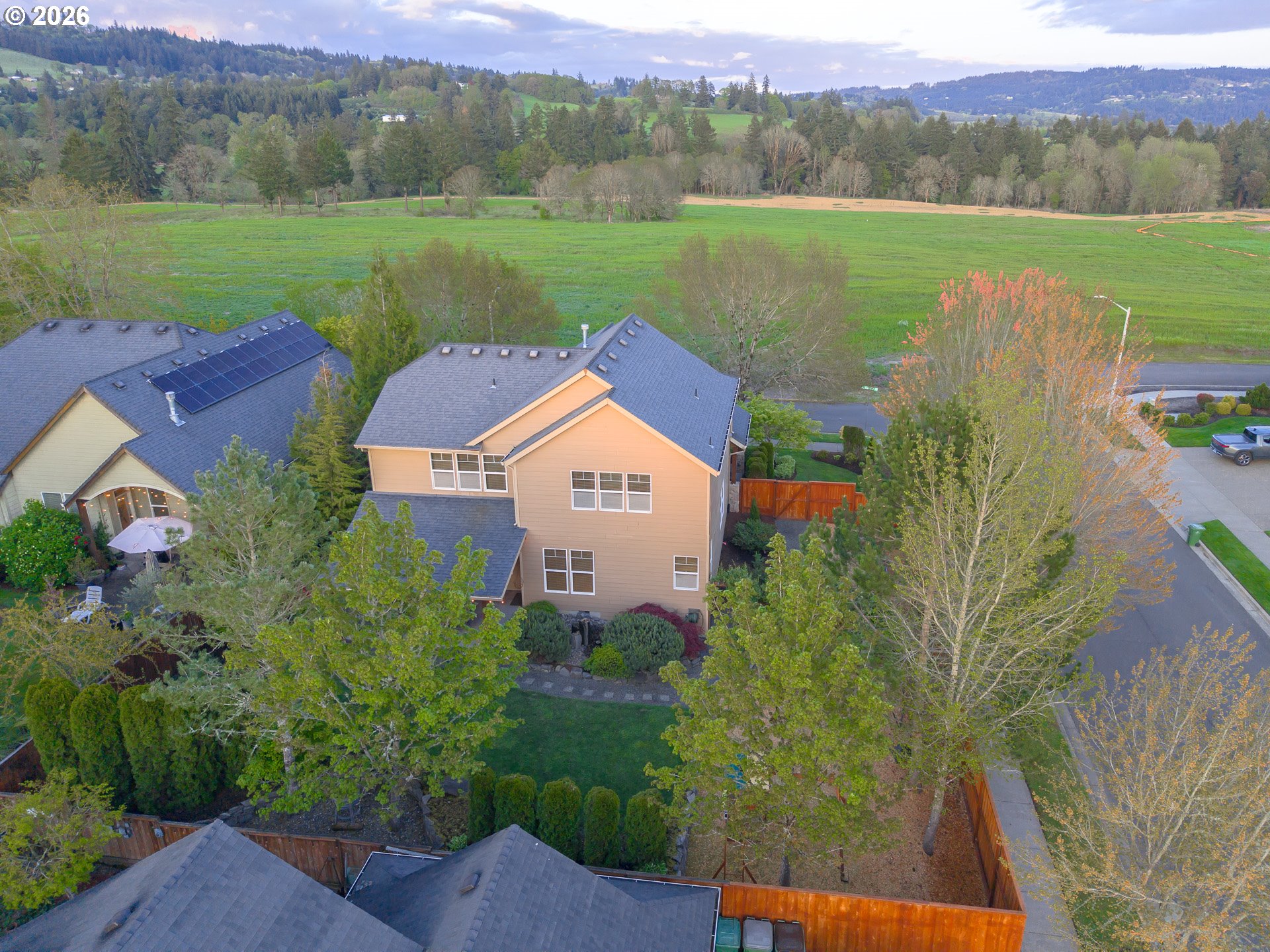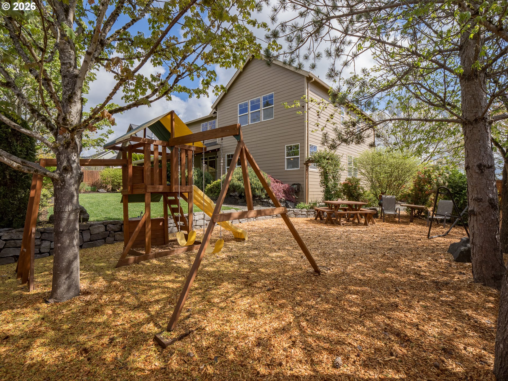 An Entertainer's Delight at Whistler's Ridge! This home welcomes you with a spacious, open foyer that immediately sets a warm and inviting tone. Abundant daylight fills the interior, creating a comfortable & welcoming atmosphere throughout the living areas. The centerpiece of the main living space is a stunning 11-foot stone-wall gas fireplace, offering both elegance & warmth. The kitchen & entertaining features are designed for culinary enthusiasts, equipped with Bosch stainless-steel appliances, a central island & a large built-in Sub-Zero wine refrigerator. This setup provides ample room for meal preparation and hosting gatherings. High ceilings contribute to an expansive area that is ideal for entertaining & dining. The flexible main-level 4th bedroom, accented with French doors & built-in cabinets, offers versatility as a guest room, den, or office, adapting easily to your needs. Upstairs features 10-ft ceilings & a spacious bonus/media room with a built-in entertainment center & an integrated indoor/outdoor sound system, perfect for media & entertainment activities. The large master suite serves as a private retreat, equipped with dual vanities, a soaking tub, a large separate shower & a generous walk-in closet. The additional bedrooms are well-sized & each include ceiling fans. The fenced private backyard includes a covered patio with a natural gas hookup, making it perfect for outdoor grilling. Professionally landscaped grounds feature a water element, a dedicated gardening area with raised beds, a 9-zone sprinkler system, a playground & a picnic area. A three-car garage offers ample parking & storage space. Additional amenities further enhance the functionality and appeal of the home. Situated in a quality neighborhood, the home offers picturesque surroundings & convenient access to Tom Gail Park & the charming downtown area of Newberg. Residents will enjoy proximity to first-class restaurants & wineries. The property benefits from having no HOA fees.