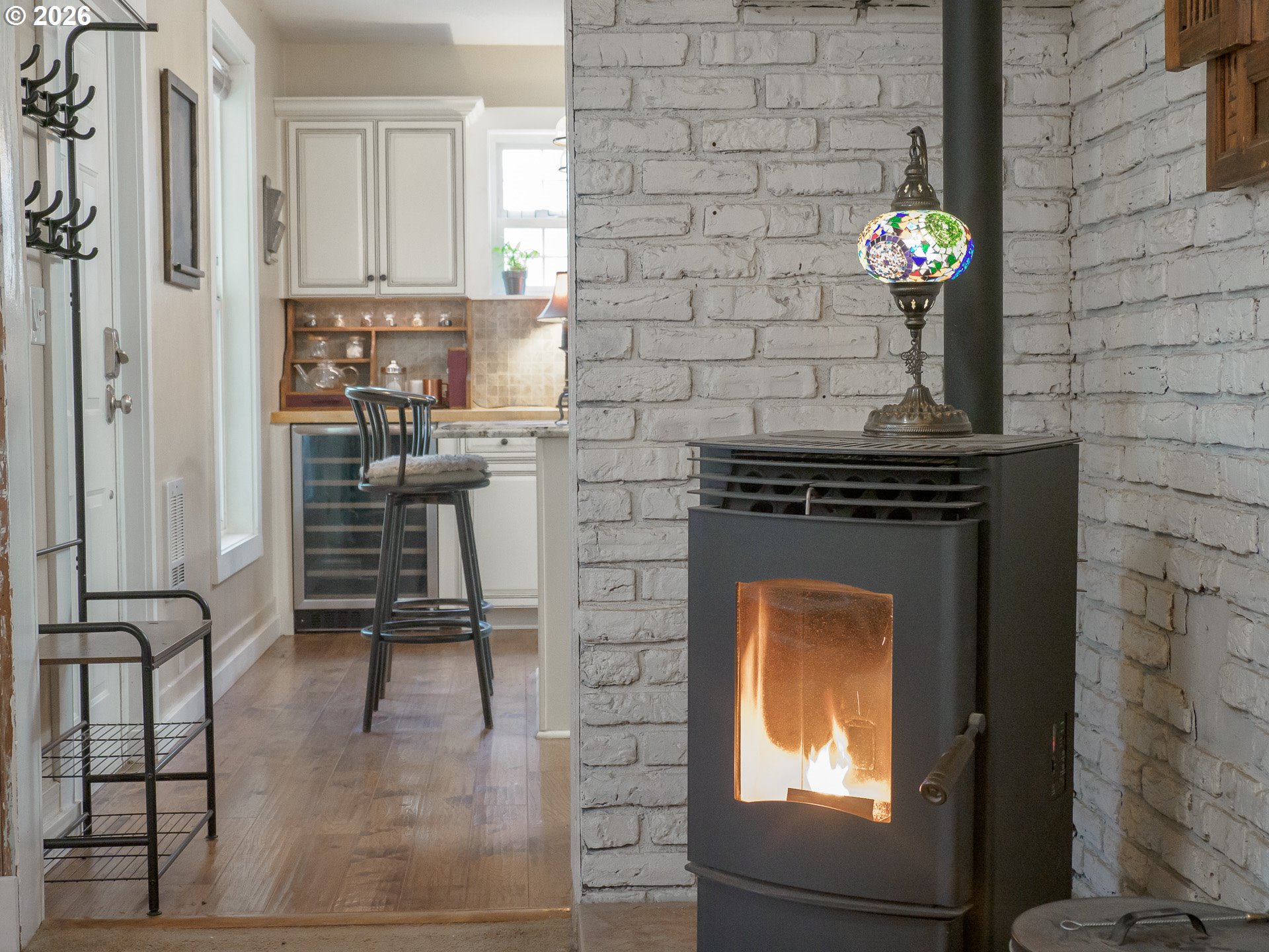 Tucked back from the road and surrounded by mature trees, this charming bungalow feels like your own private retreat while still being close to everyday conveniences. Step inside to a beautifully updated kitchen featuring warm hickory floors, butcher block countertops, island with granite countertop, new cabinetry, and a full suite of newer appliances, including a double oven, built-in microwave, dishwasher, and wine fridge, perfect for both daily living and entertaining. The cozy living room centers around a pellet stove that adds warmth and character, creating an inviting space to relax on chilly evenings. Three comfortable bedrooms offer flexibility for family, guests, or creative use, while the oversized laundry room just off the kitchen easily doubles as a home office, craft room, or hobby space. Outside, nature takes center stage. The private setting, mature trees, and visiting wildlife create a peaceful backdrop for morning coffee on the covered front porch or quiet evenings on the covered rear patio. A spacious shop provides room for storage, or equipment, and an additional storage shed adds even more functionality. Thoughtful updates, including a mini split system for efficient heating and cooling and an upgraded electrical panel, mean you can move in and enjoy from day one. Cute, comfortable, and full of personality, this home is ready to welcome its next owners.