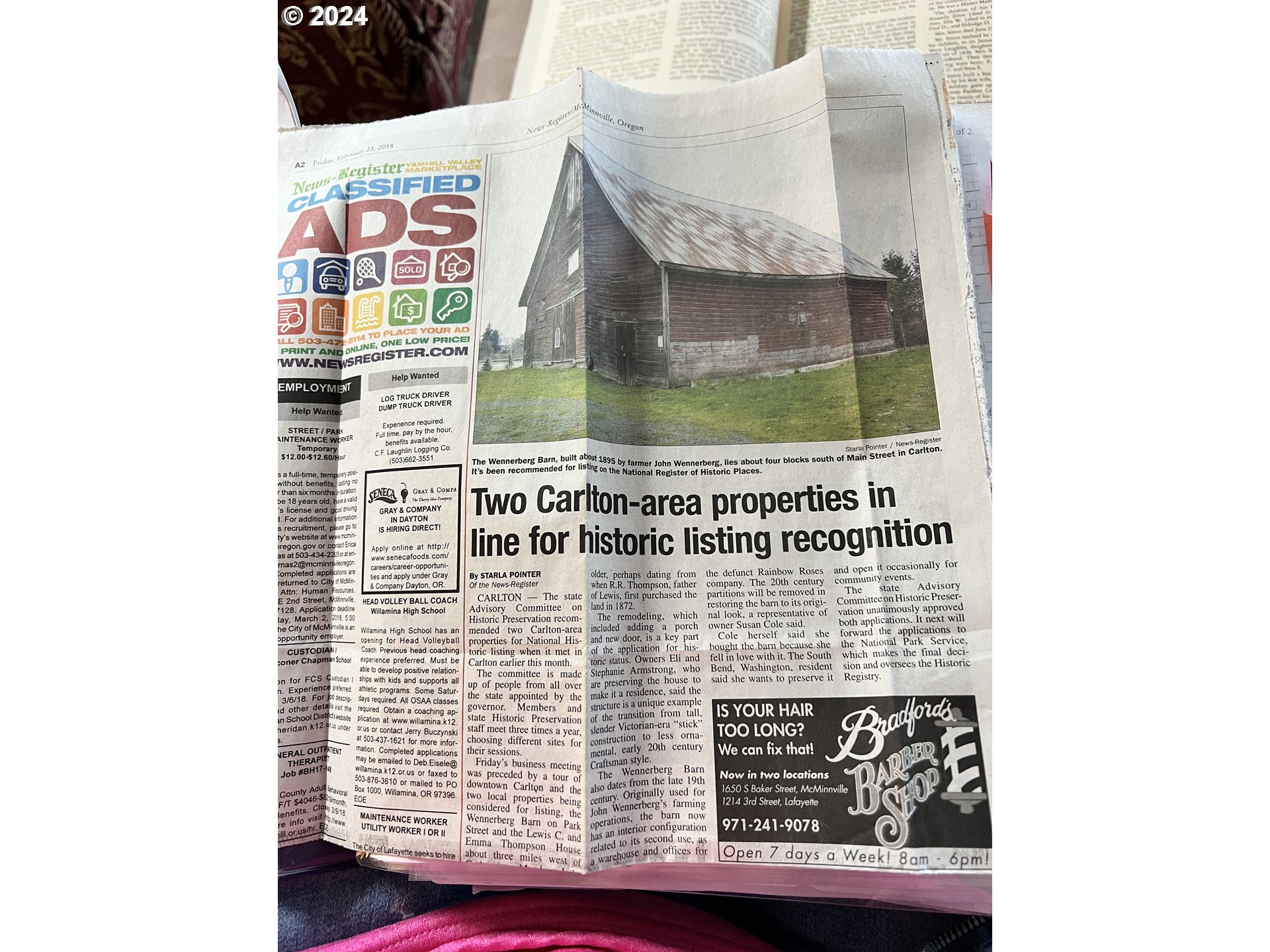 “If you can dream it,you can do it” Opportunity awaits the dream maker! *Two structures Two opportunities *A Heritage Barn (1895)*A converted shed (1917) to COTTAGE (2016) *Located on a large corner lot — 4 blocks from town BARN — (“Wennerberg”) Center bay currently serves as a gathering place where friends + family share in live music, amazing food, and good cheer! Upper loft has a three room enclosure/blank slate for any number of uses. Two other bays offer storage or your re-imagined spaces.COTTAGE is a cozy*fully furnished*efficiency studio with sleeping alcove/dining+eating spaces/modified antique hutch w sink/living area/washer-dryer closet/3/4 bath/viewing deck+ patio for entertaining/relaxing while drinking in your partial coastal mountain view Think mini herb/lavender farm/ woodworking shop/artist studio/motorcycle or bicycle maintenance/whatever your passion or whim!Must see to appreciate! New metal roof on south side of barn.#City of Carlton OR#OR Wine Country#Barn#Cottage