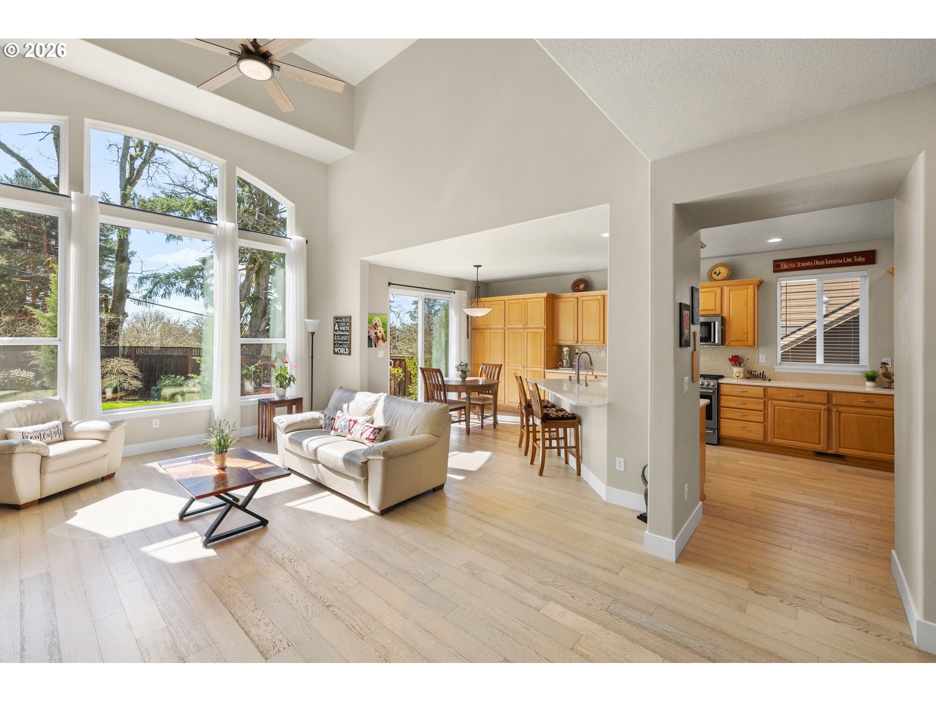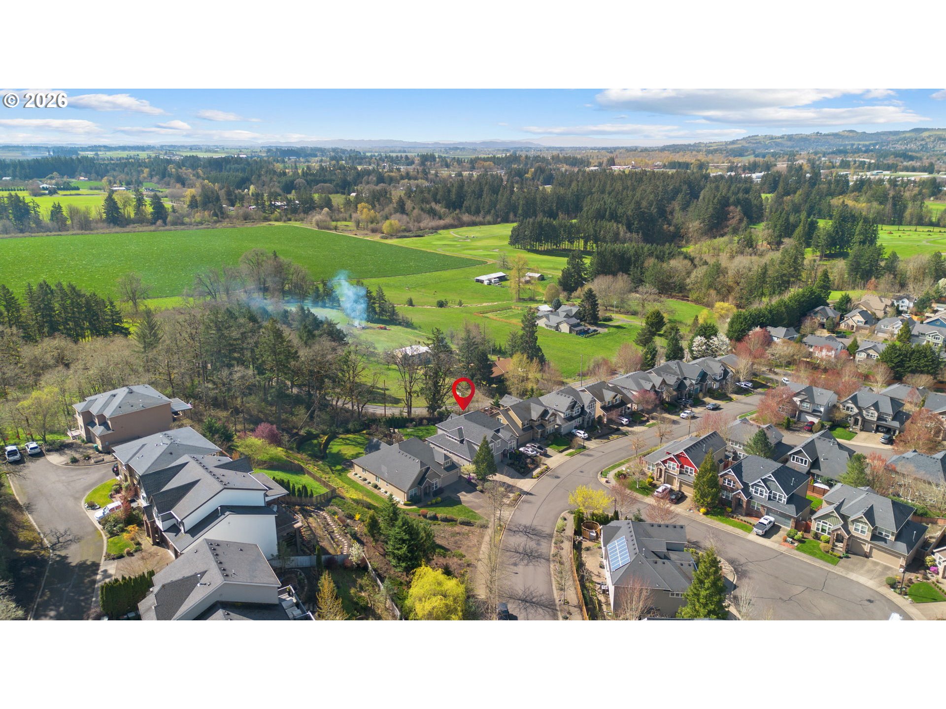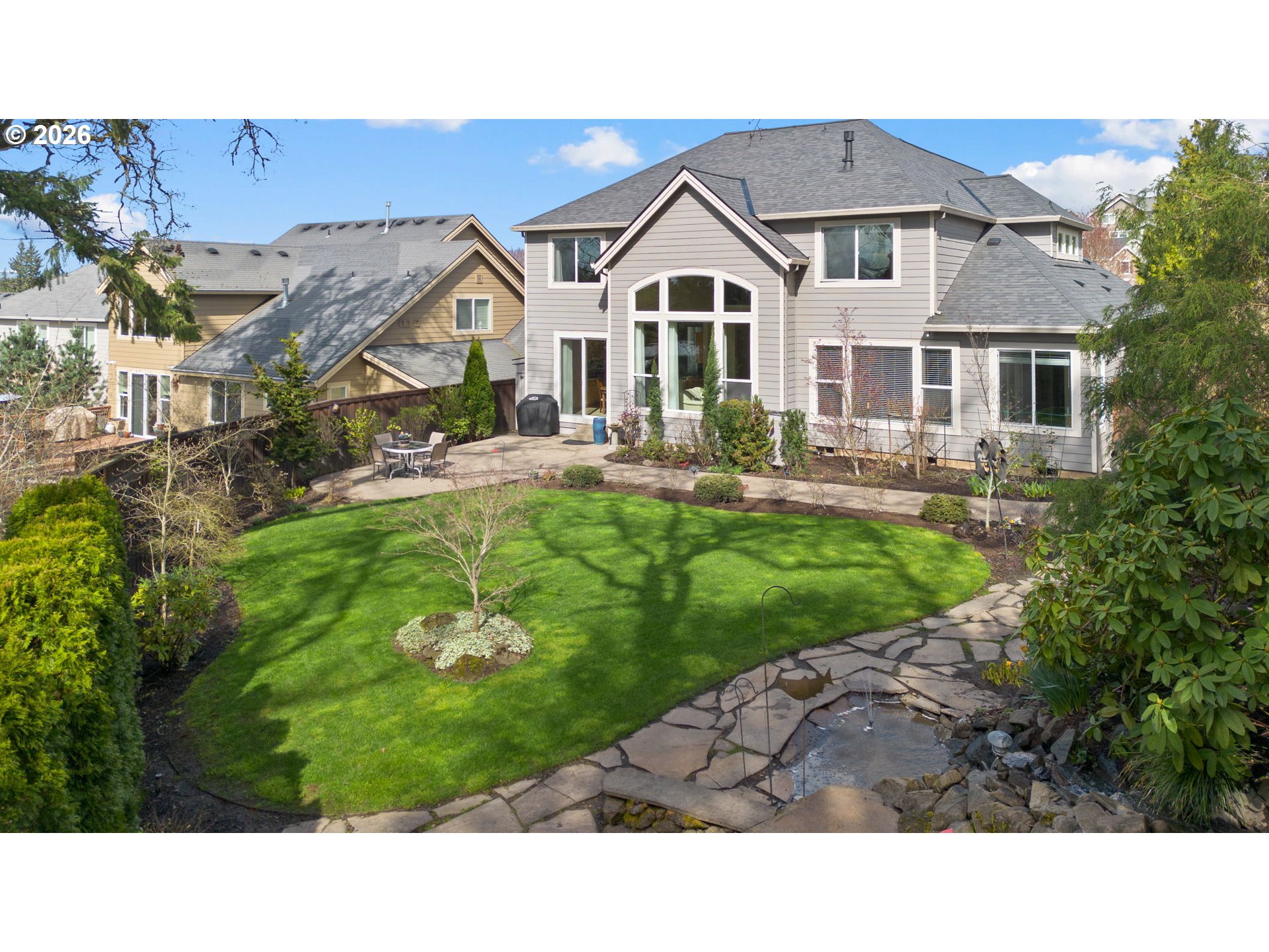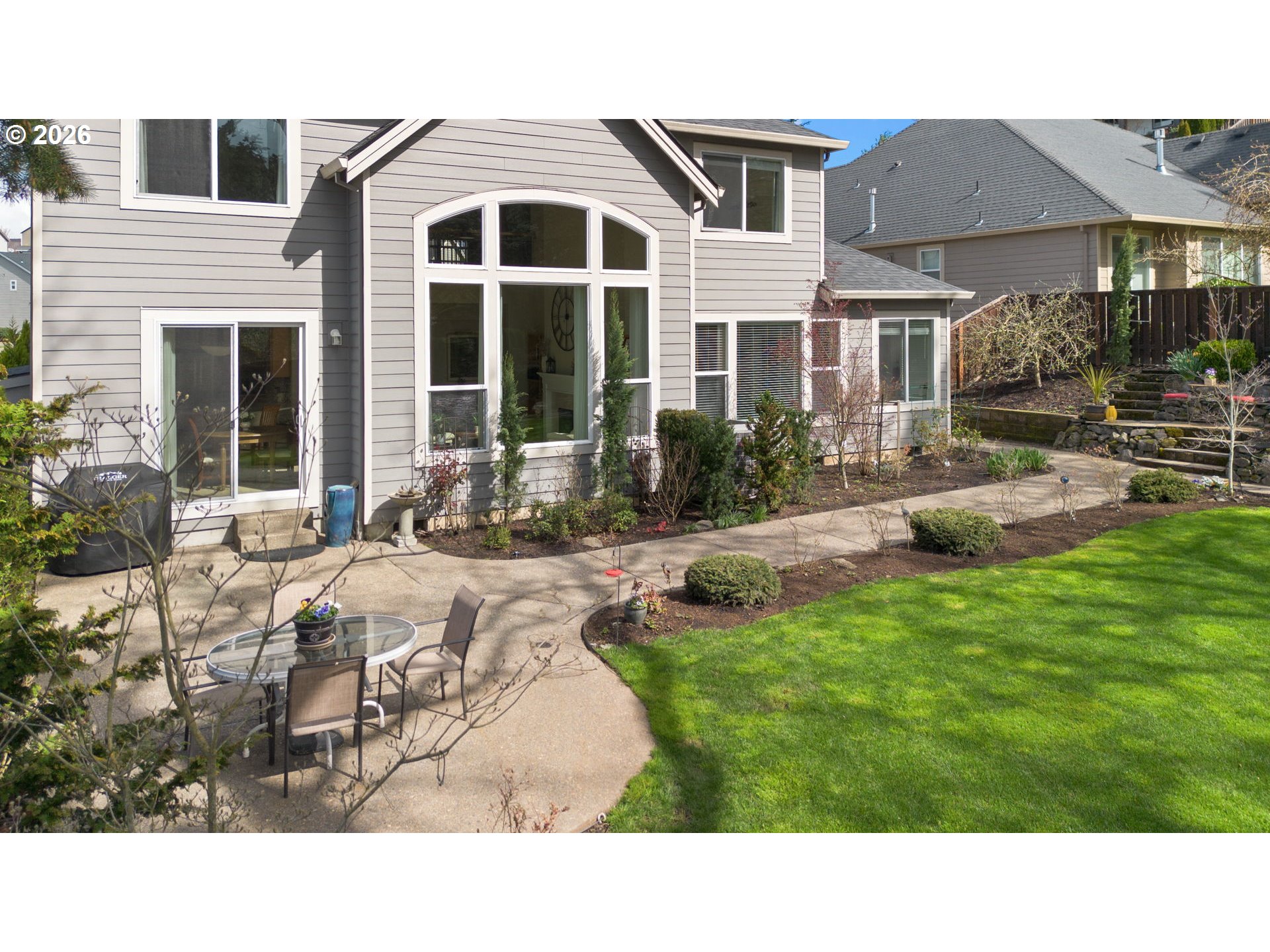 Light & bright with wall of windows, soaring ceiling & warm natural light throughout. All essential living spaces on the main, plus fantastic space upstairs, 3 car garage & incredible outdoor living. This home is a 10! Located in highly desirable "The Greens" neighborhood, the home blends comfort, functionality & outdoor living. The layout supports everyday convenience & long-term flexibility. The level extended driveway maximizes the 3-car garage versatility — perfect for vehicles, hobbies, or shop/workspace. The walk-out backyard is beautifully landscaped providing your own private oasis. Mature fruit trees & berry bushes offer seasonal harvests, the water feature adds ambiance, and the built-in firepit is perfect for gatherings or quiet evenings making memories. Major systems have been updated, offering peace of mind for years to come: New 50 year roof (2024), new HVAC system (2023), crawl space refresh (2025). A rare opportunity in a sought-after location — this home truly delivers on lifestyle, comfort & value. Make sure to download the features sheet & watch the 2 minute video